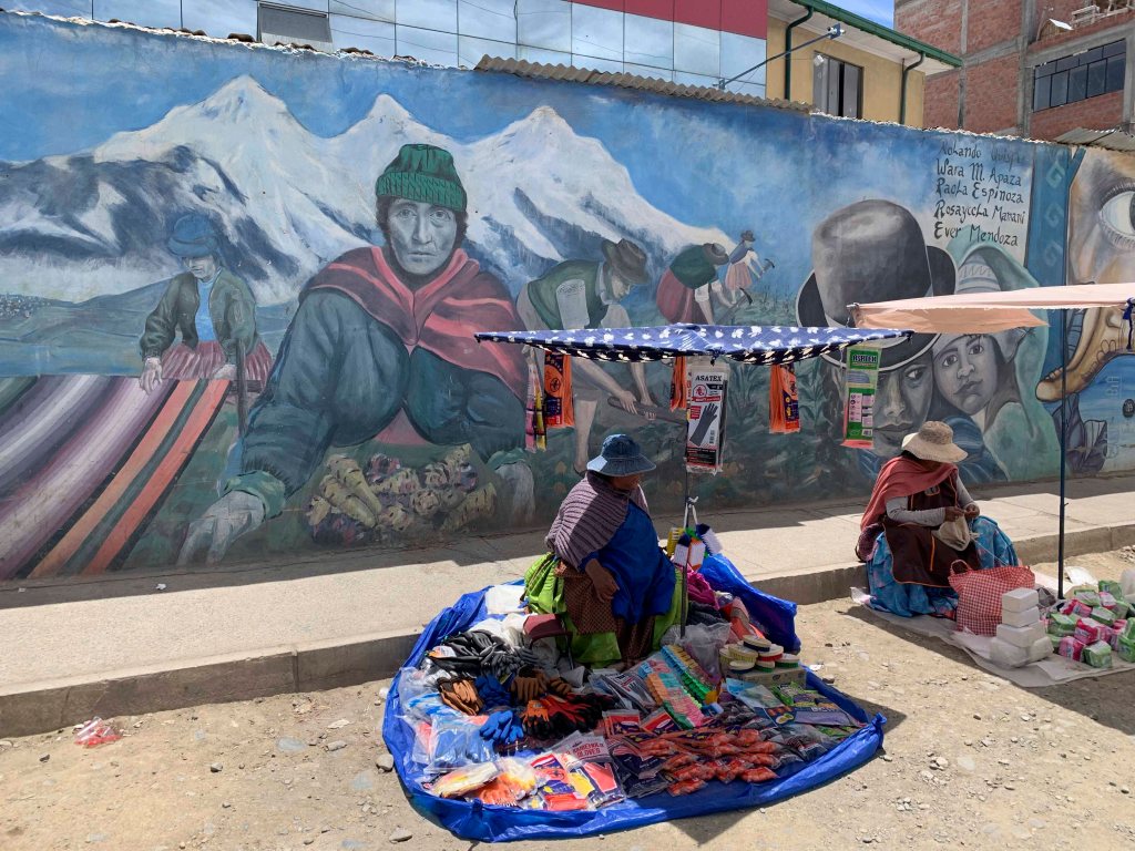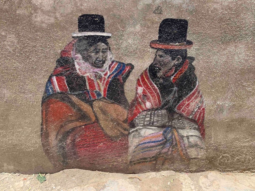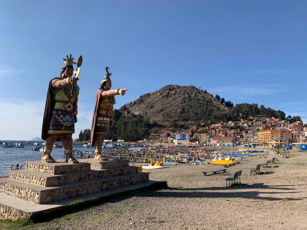 Wenn man am Titicacasee entlang nach Bolivien kommt, drängt es sich geradezu auf, zuerst nach Copacabana zu gehen. Der kleine Ort behauptet, seinen Namen lange vor dem gleichnamigen Strand in Rio de Janeiro gehabt zu haben, und liefert mehrere Geschichten dazu. Heutzutage lohnt sich der Besuch wegen der wirklich schönen Bucht mit einem herrlichen Blick auf den See. Strenge Inkafiguren wachen darüber, dass die Touristen es nicht zu toll treiben, es gibt Schiffe zur Isla del Sol, einiges an Tretbooten und direkt daneben wird Wäsche gewaschen. Das ist Südamerika! Das Dorf selbst taugt allenfalls für einen Spaziergang, man schaut sich die Kathedrale an und fotografiert Graffitis, da die Bolivianer zumindest hier richtig grantig werden können, wenn man ein Foto von ihnen machen möchte. – Deshalb haben wir die tollen Zöpfe unter runden Hüten und die üppigen Röcke meist nur von hinten festgehalten.