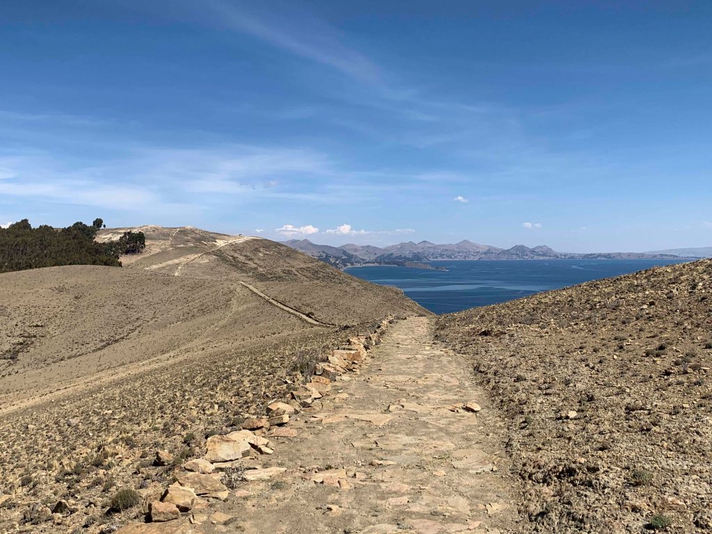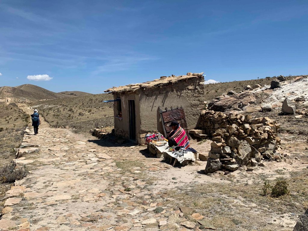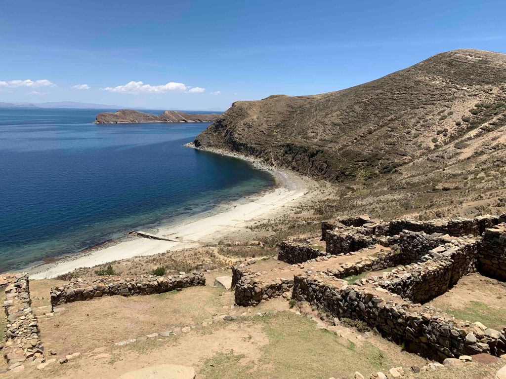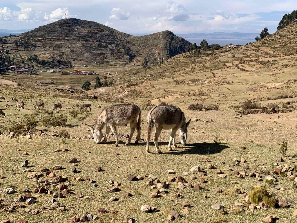 Ein wunderschönes Ausflugsziel von Copacabana aus ist die Isla del Sol. Zusammen mit der nahegelegenen Isla de la Luna diente die Insel den Inkas für ihre Schöpfungsgeschichte: Hier sollen Sonne und Mond auf die Erde gekommen sein, um die Menschen zu erschaffen. Es gibt sogar einen ausgehöhlten Felsen, in dem die Sonne geschlafen haben soll und große „Fußabdrücke“ von ihrem Marsch über die Insel. – Geblieben ist ein schöner Wanderweg von einem Inselende zum anderen, den man auf keinen Fall verfehlen kann (Das war die große Sorge unseres Guides, als wir allein gehen wollten). Die Strecke bietet eigentlich ununterbrochen herrliche Ausblicke auf den See und die fernen Ufer Perus und Boliviens, eindrucksvolle Inkaruinen, süße Esel und reichlich Sonne… Außerdem gibt es sehr nette Kioske von Inselbewohnern am Wegesrand! Mitten auf dem Inselrücken kochte eine ältere Frau uns frischen Cokatee, der uns Energie und Schwung für die zweite Hälfte des Weges gab.