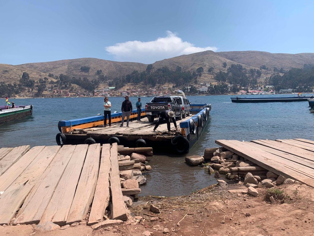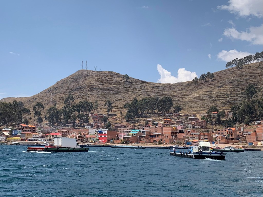 Die Fahrt nach La Paz führt zunächst in etlichen Schlenkern am Titicacasee entlang und zeigt dann die nicht besonders spannende Landschaft in diesem Teil Boliviens. Aber zum Glück gilt es, eine Engstelle des Sees per Fähre zu überqueren, und das ist schon ein bisschen abenteuerlich, da die Fährboote super schlicht und wackelig sind. Wir waren froh, weder mit einem Bus noch mit einem Lastwagen zusammen überzusetzen, denn das verstärkt das Geschaukel deutlich. Insgesamt dauerte die Aktion ungefähr eine halbe Stunde und verlief dann doch unproblematisch.