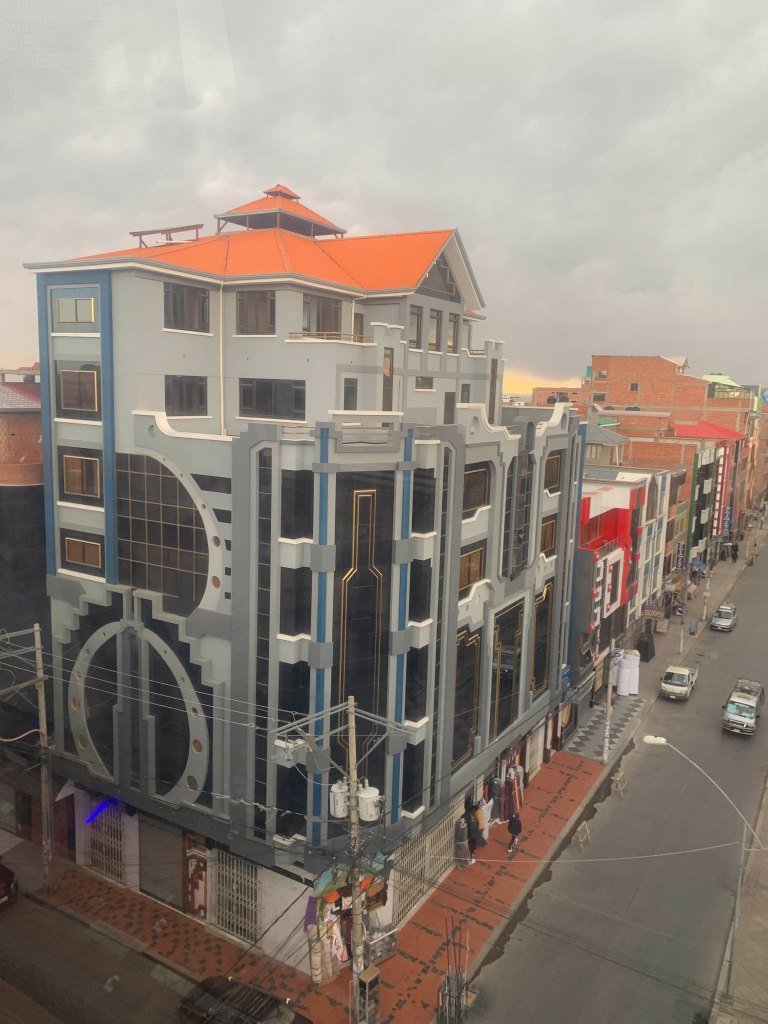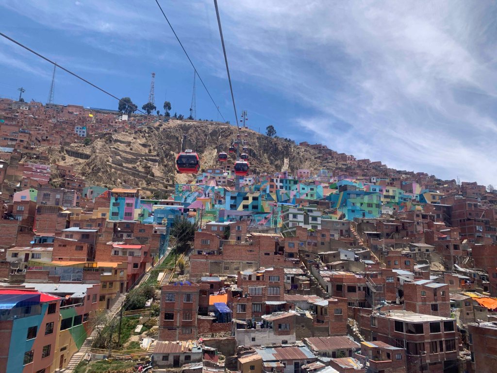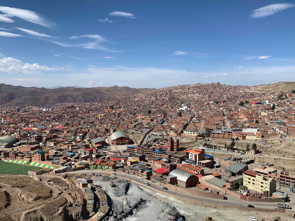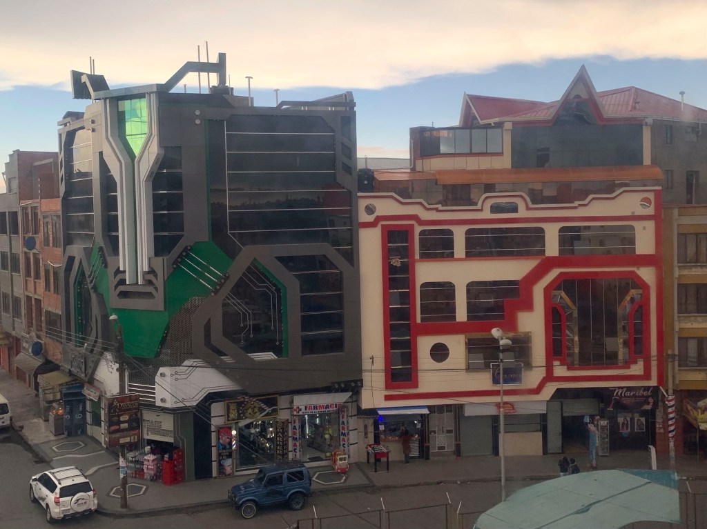 Die Schwesterstadt von La Paz auf 4100 Metern Höhe, El Alto, war uns als größter Slum der Welt angekündigt worden. Das fanden wir dann für die sehr junge Stadt mit ihren rund einer Million Einwohnern ziemlich ungerecht. Natürlich sieht man wie überall in Bolivien jede Menge unfertige Häuser ohne Putz sowie unaufgeräumte Hinterhöfe und ungepflasterte Straßen. Aber zumindest von der Seilbahn aus, die in La Paz insgesamt als praktisches Verkehrsmittel dient, sind Ordnung und Systematik zu erkennen. Es ist wohl eher so, dass das schnelle Wachstum El Altos die Verwaltung überfordert und deshalb vieles noch nicht gut organisiert ist. Die Bewohner jedoch sind hoffnungsvoll, dass sich hier alles noch zum Besseren wandeln wird. – Bislang versuchen Architekten mit dem Einsatz von Farbe und verrückten Formen in einer eigenen Häuserkultur, den Cholets, die Hauptstraßen El Altos heiter und interessant zu prägen.