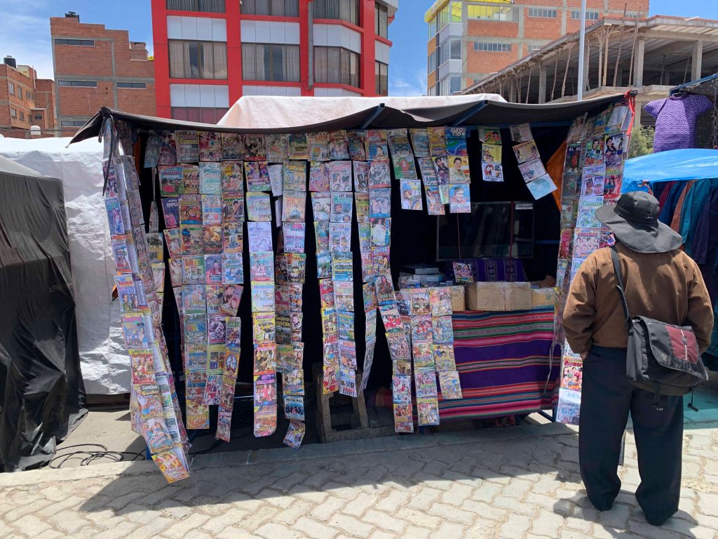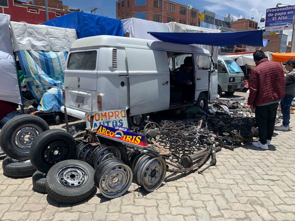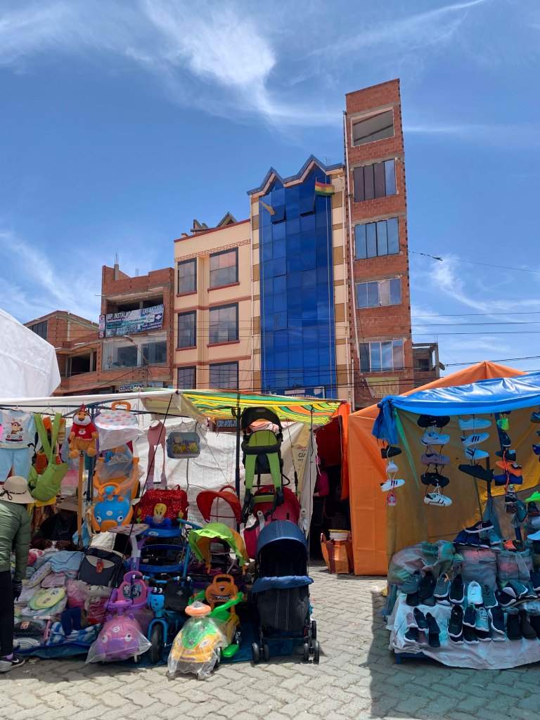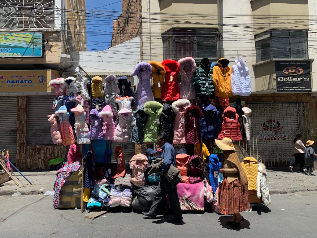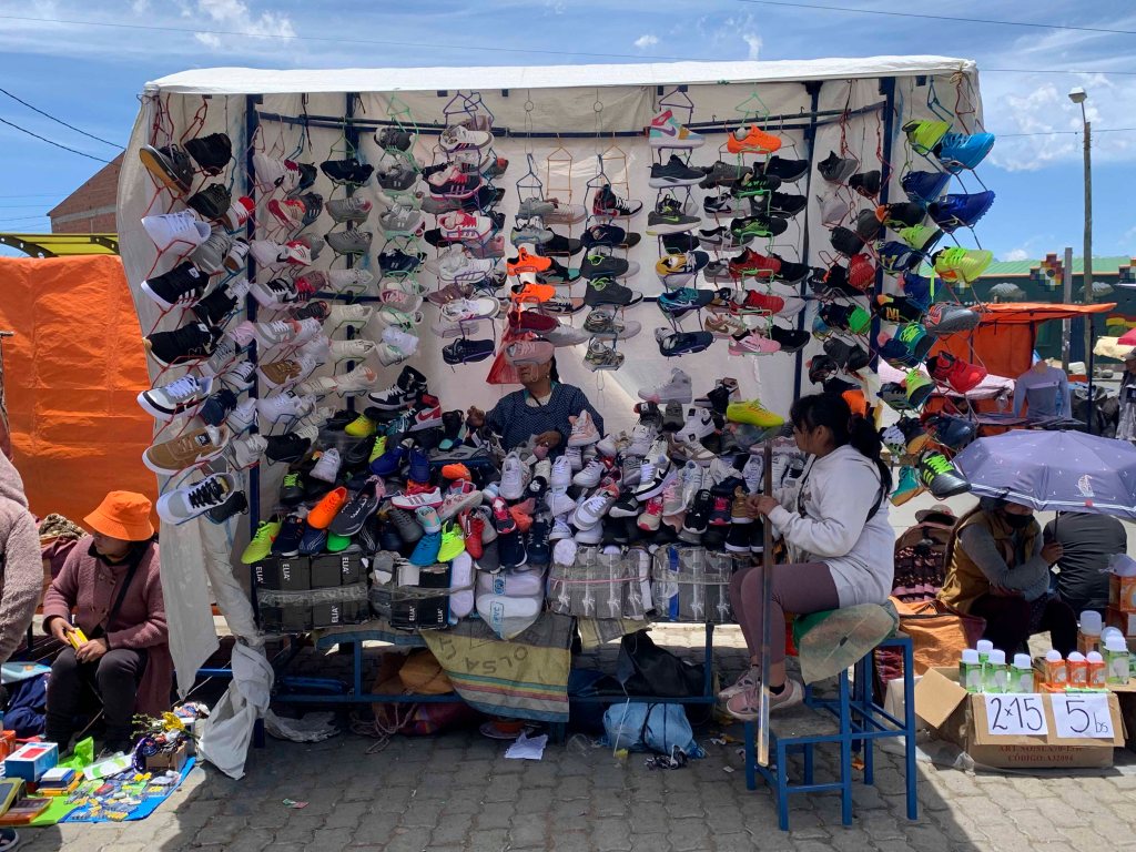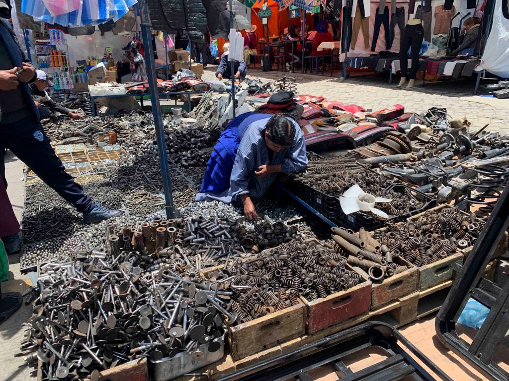 Die große Fería am Sonntag in El Alto sollte man sich auf keinen Fall entgehen lassen, wenn man Märkte liebt! Die Reihen der zahllosen Stände beginnen bereits direkt an der Seilbahnstation und erstrecken sich weit in die umliegenden Straßen hinein. Wir sind während unseres einstündigen Besuchs nicht über den Kleider- und Autoteilesektor hinausgelangt, wahrscheinlich kann man auch den halben Tag dort verbringen… Immer wieder begeistern die Mengen an ausgebreiteten Waren verschiedenster Art und die energischen älteren Frauen, die einem als Tourist mit ihren strengen Blicken und ihrem Einfallsreichtum beim Geldverdienen Respekt einflößen.