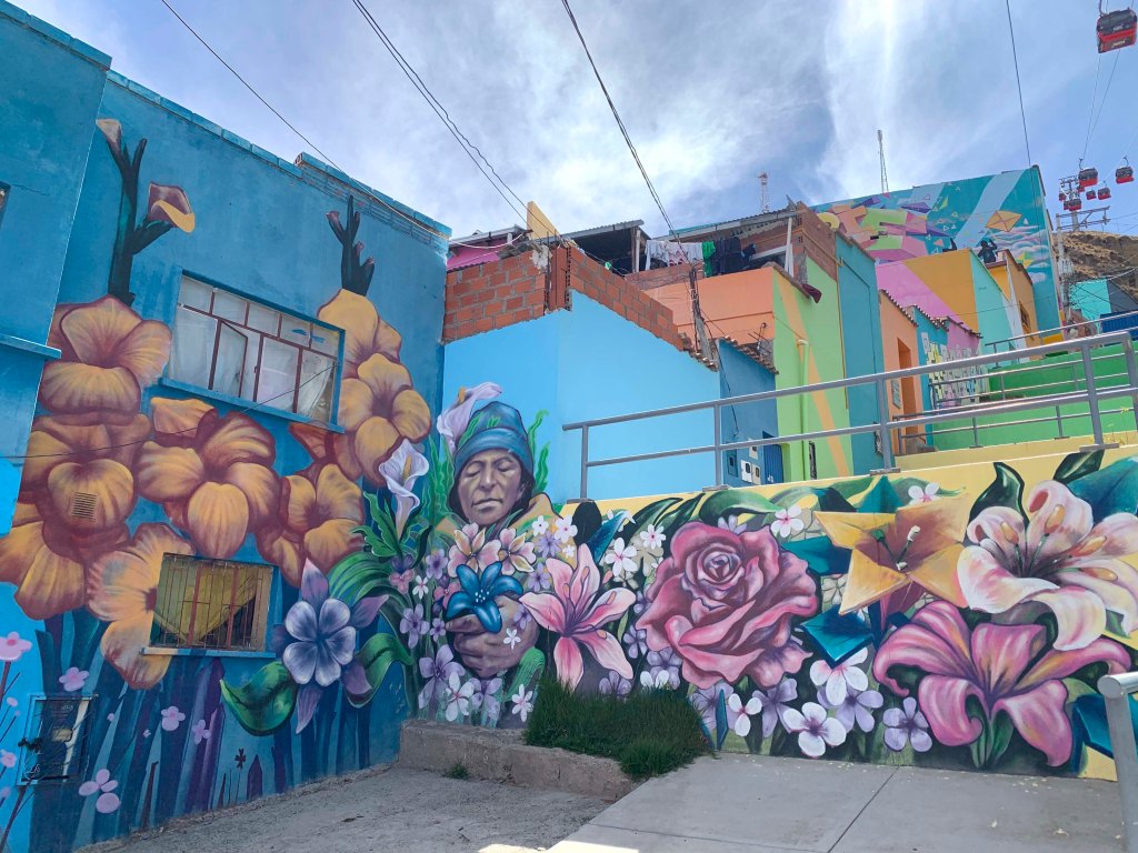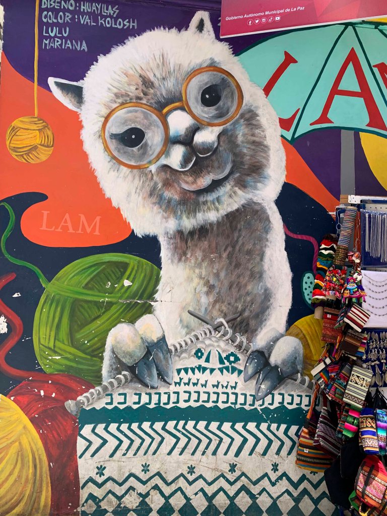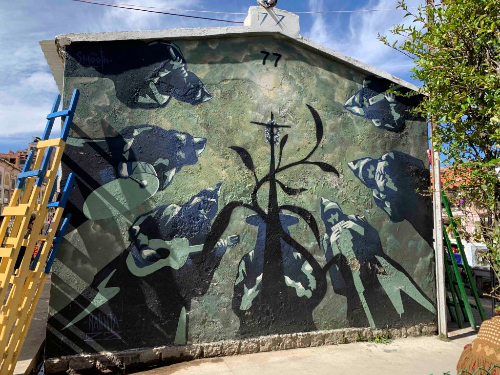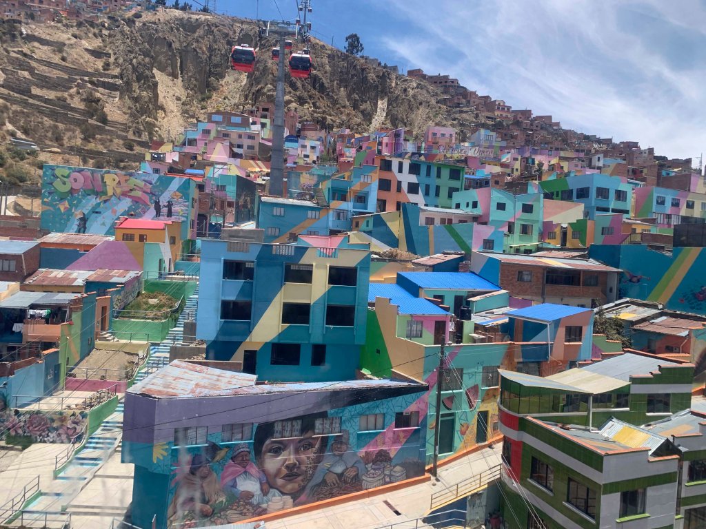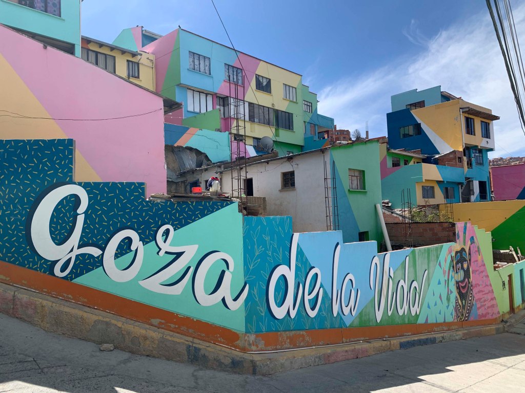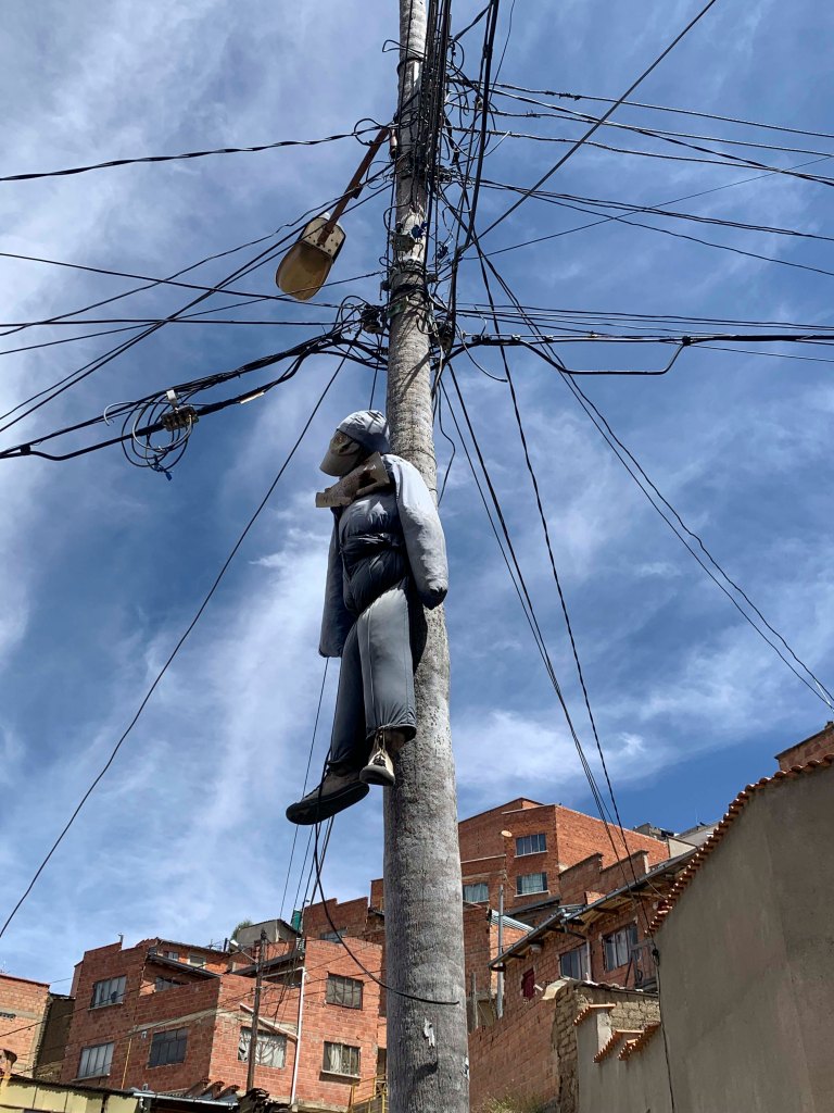Schon auf der ersten Seilbahnfahrt war uns inmitten der ziegelbraunen Häuserflut ein Viertel aufgefallen, das sich frech und fröhlich abhob: Cancha Chualluma ist ein schönes Beispiel dafür, dass die Einfälle von Politikern im Wahlkampf auch mal richtig Früchte tragen können. Ein Projekt hat vor einigen Jahren bewirkt, dass über mehrere Straßenzüge hinweg sämtliche Häuser bunt angestrichen und mit kunstvollen Graffitis bemalt wurden. Das Motto lautete, ein schöneres Viertel kann dafür sorgen, dass die Bewohner mehr Freude am Wohnen haben und negative Stimmung keine Chance bekommt. – Wenn man durch die Straßen spaziert, kann man sich gut vorstellen, dass das funktioniert! Allerdings erinnern so schräge Erscheinungen wie erhängte Stoffpuppen daran, dass die Realität auf den Straßen von La Paz noch stark von Kriminalität geprägt ist, denn sie symbolisieren den Wunsch vieler Einwohner nach Sicherheit: „Finger weg von unserem Eigentum, ihr Diebe, sonst setzt es drastische Strafen!“