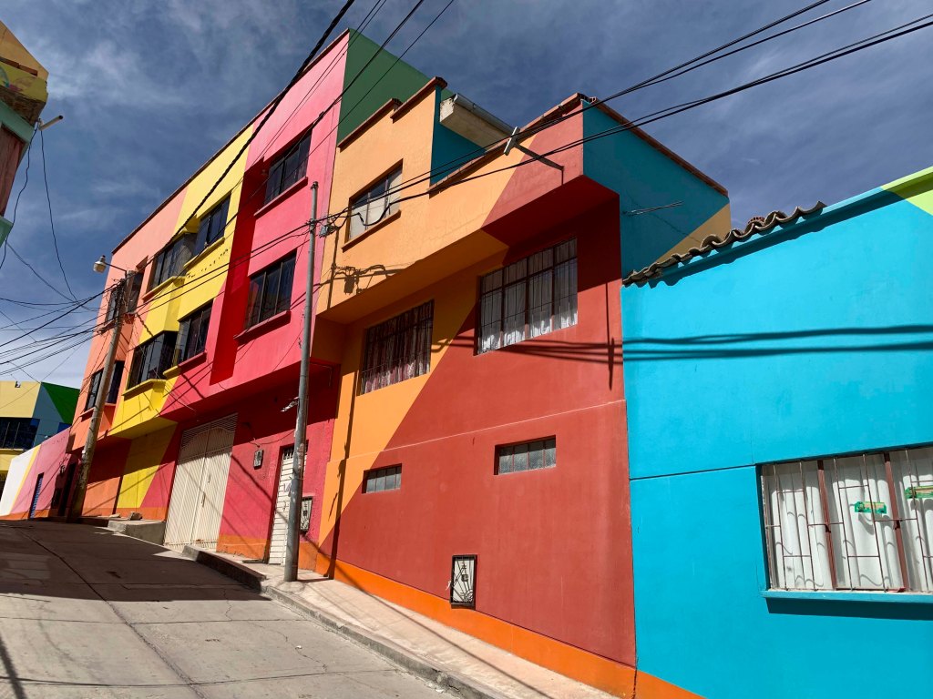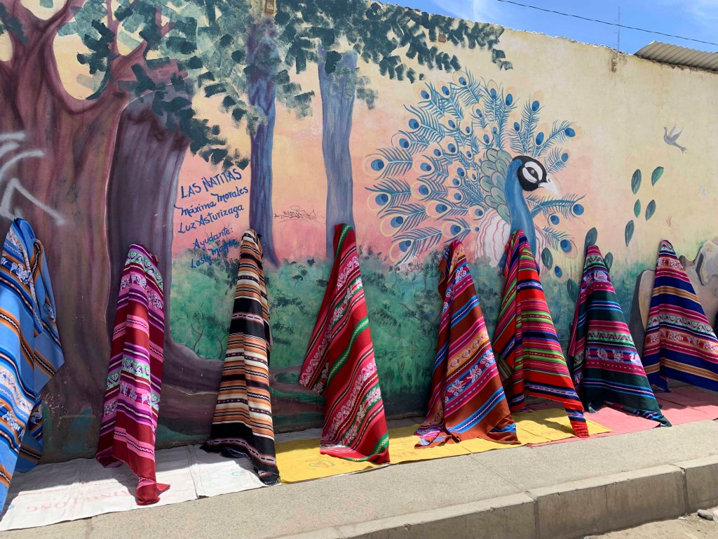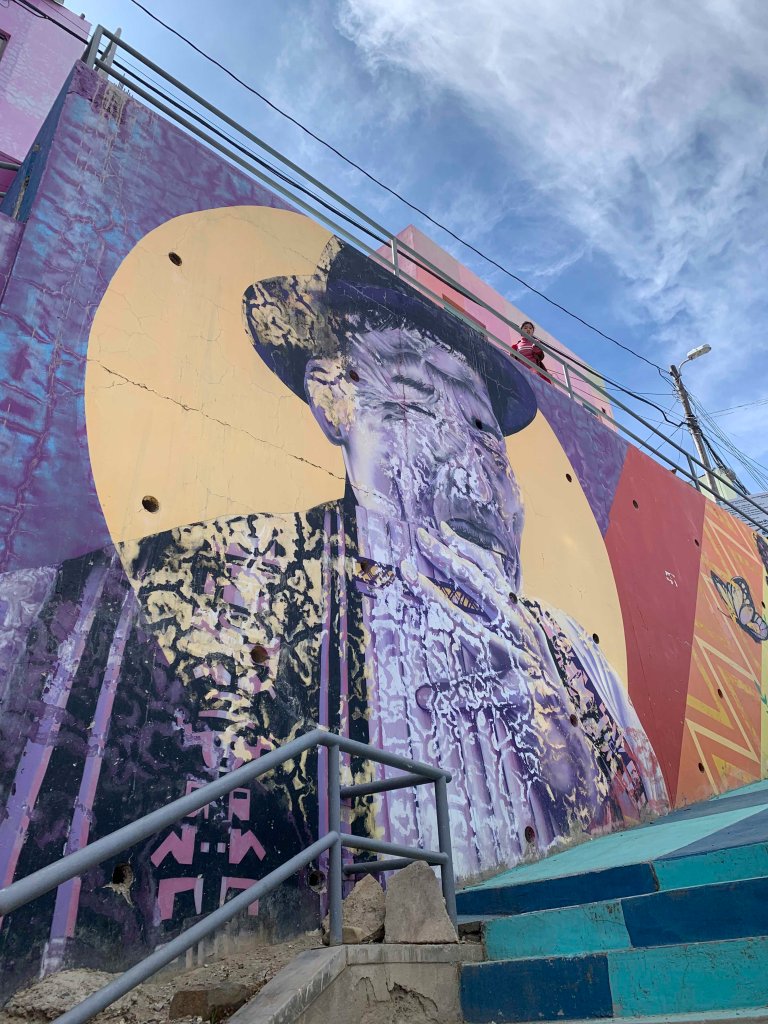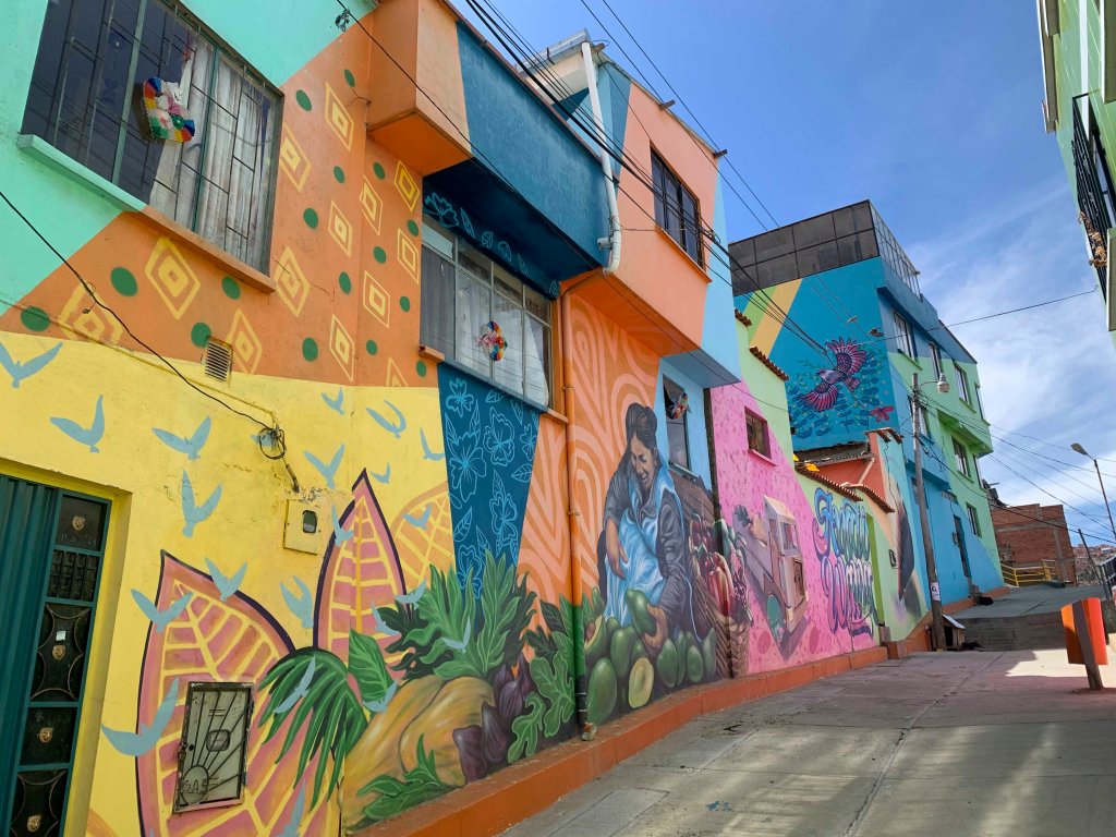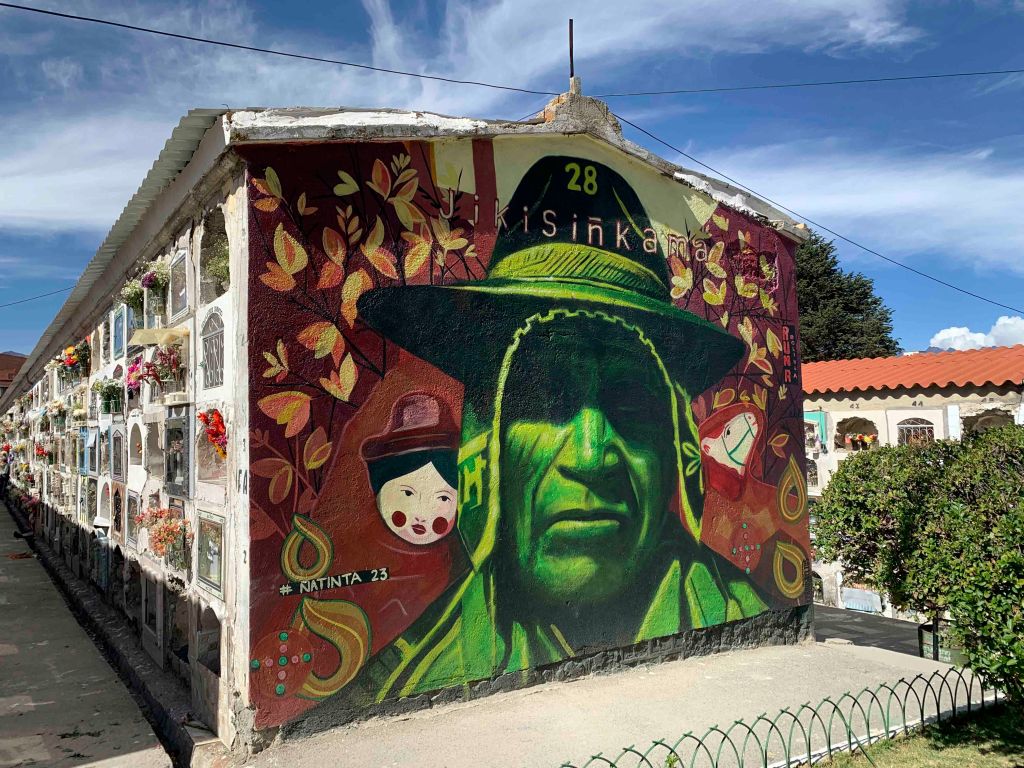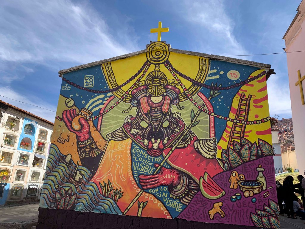Schon auf der ersten Seilbahnfahrt war uns inmitten der ziegelbraunen Häuserflut ein Viertel aufgefallen, das sich frech und fröhlich abhob: Cancha Chualluma ist ein schönes Beispiel dafür, dass die Einfälle von Politikern im Wahlkampf auch mal richtig Früchte tragen können. Ein Projekt hat vor einigen Jahren bewirkt, dass über mehrere Straßenzüge hinweg sämtliche Häuser bunt angestrichen und mit kunstvollen Graffitis bemalt wurden. Das Motto lautete, ein schöneres Viertel kann dafür sorgen, dass die Bewohner mehr Freude am Wohnen haben und negative Stimmung keine Chance bekommt. – Wenn man durch die Straßen spaziert, kann man sich gut vorstellen, dass das funktioniert! Allerdings erinnern so schräge Erscheinungen wie erhängte Stoffpuppen daran, dass die Realität auf den Straßen von La Paz noch stark von Kriminalität geprägt ist, denn sie symbolisieren den Wunsch vieler Einwohner nach Sicherheit: „Finger weg von unserem Eigentum, ihr Diebe, sonst setzt es drastische Strafen!“