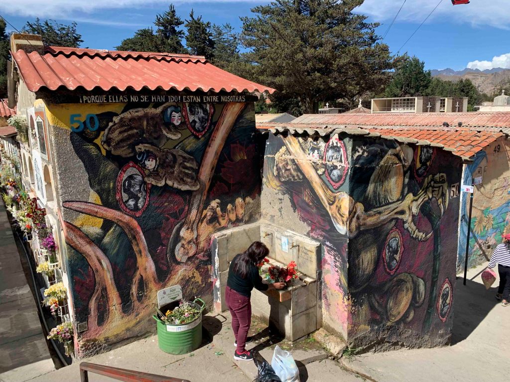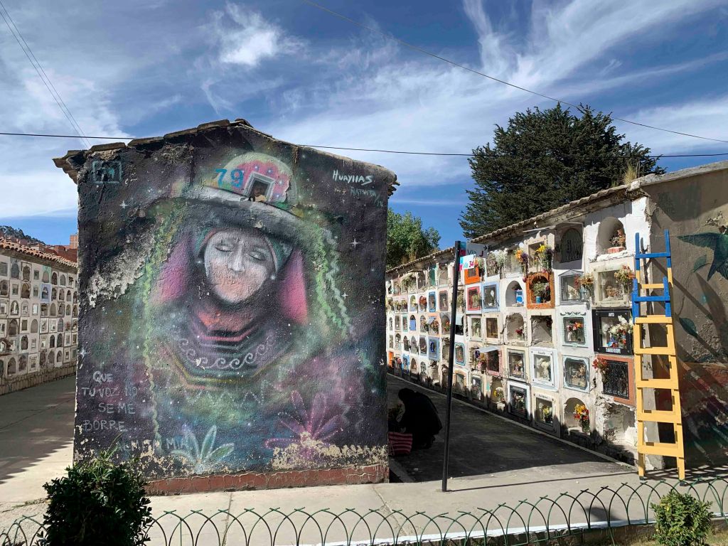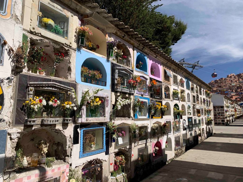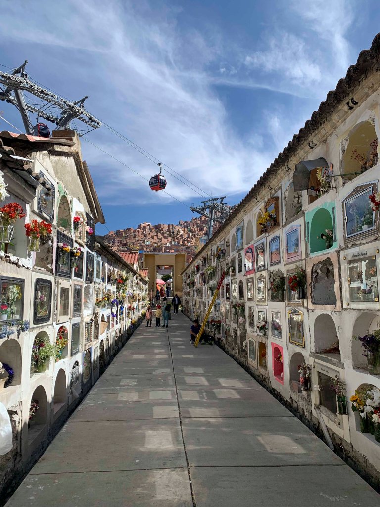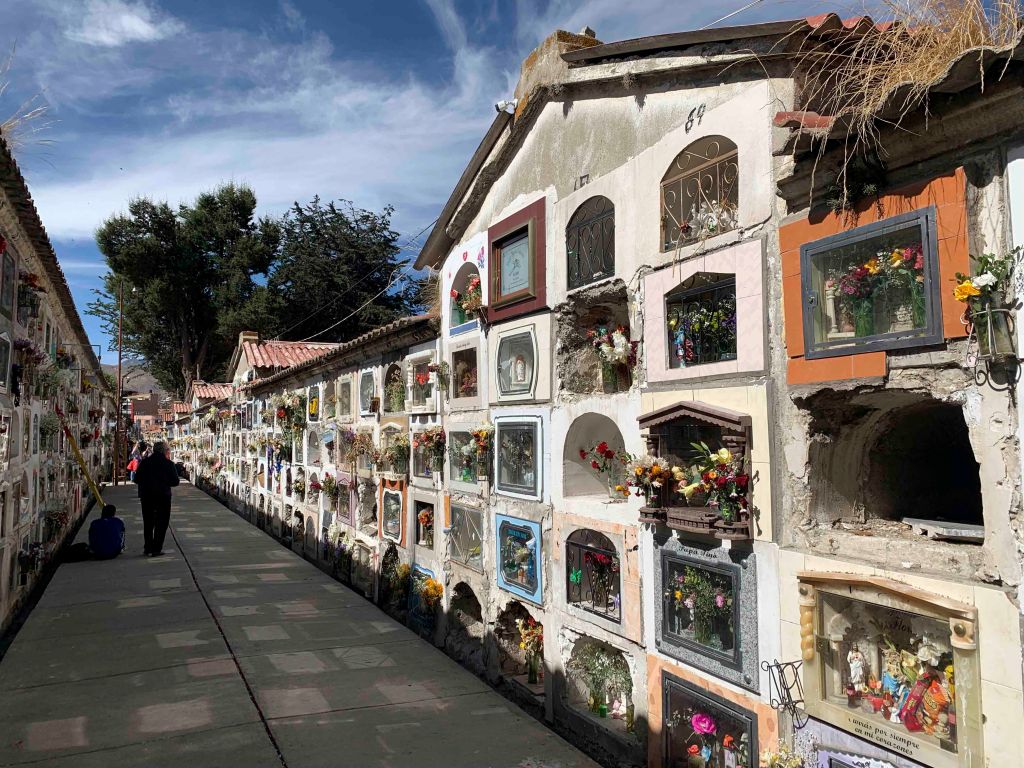 Schon in Buenos Aires hatten wir ja gesehen, dass Friedhöfe einen ganz besonderen Charme haben können. Das zeigte sich auch in La Paz - und sogar noch sehr viel skurriler! Zum einen ist der Cementerio General riesig, er besteht aus etlichen Reihen fünfstöckiger Gebäude mit Grabnischen, die inzwischen bereits von weiteren, noch höheren Häusern ergänzt werden. Zum anderen, und das ist das Interessante, ist dieser Friedhof ein ungemein lebendiger Ort. Wir waren kurz nach Allerheiligen in La Paz, das hier intensiv begangen wird: Ganze Familien kommen auf den Friedhof, um die Gräber ihrer Verstorbenen zu besuchen, schmücken diese oft kunterbunt, bringen Lieblingsgetränke oder -speisen der Toten mit, beten oder singen gemeinsam. Dabei rennen Kinder herum und Hunde werden mitgebracht, es ist alles, nur nicht leise und bedächtig! Für uns war das ungewohnt, aber es repräsentiert eigentlich eine gelungene Verknüpfung von Leben und Tod.