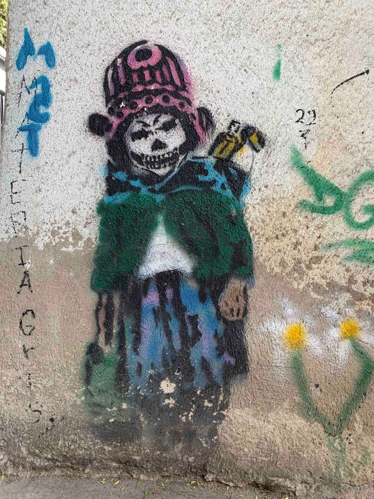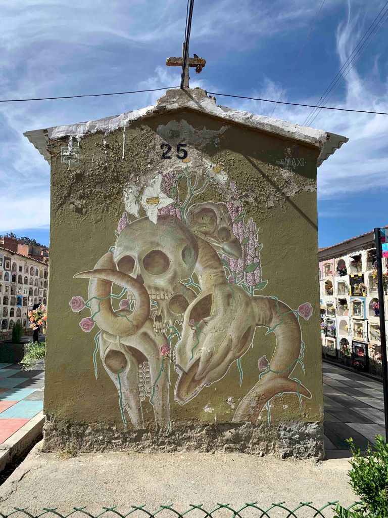 Das ganz Besondere an diesem Friedhof waren jedoch die vielen Graffitis an den Stirnseiten der Grabgebäude. Ihre Größe und sorgfältige Ausführung zeigte, dass sie anerkannt sind und offiziell gemalt wurden. Unser Eindruck war, dass diese Bilder sich sehr ehrlich und ohne falsche Scheu mit dem Tod auseinandersetzen: mit Ängsten, Aberglauben und auch zum Teil mit allerlei gruseligen Ideen oder einem Hauch von Horror.