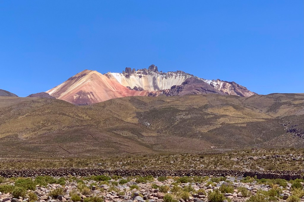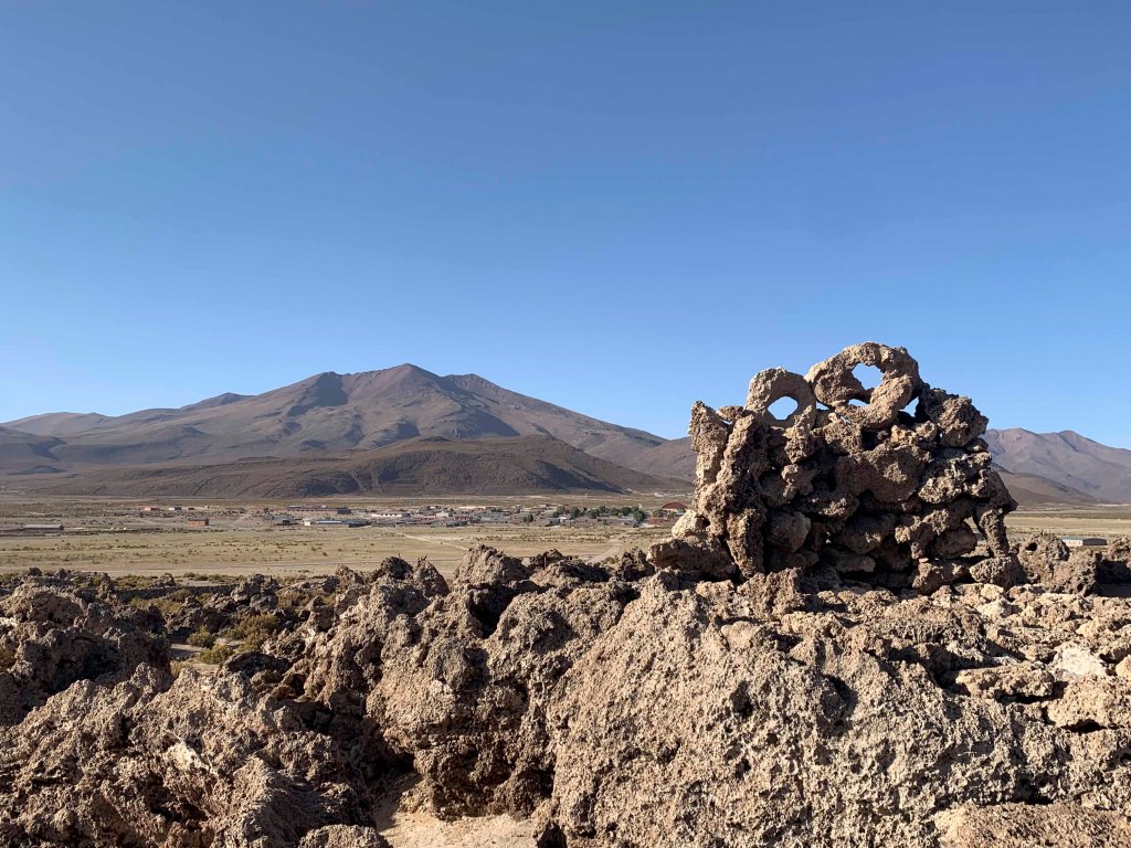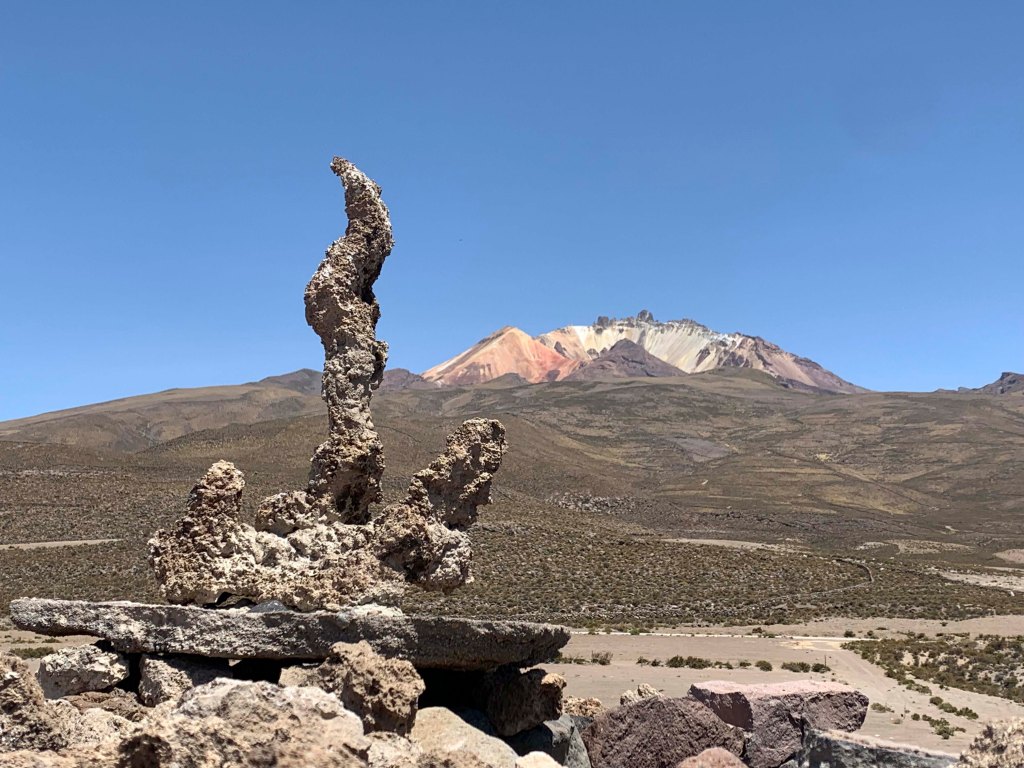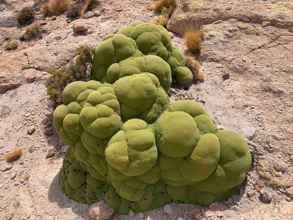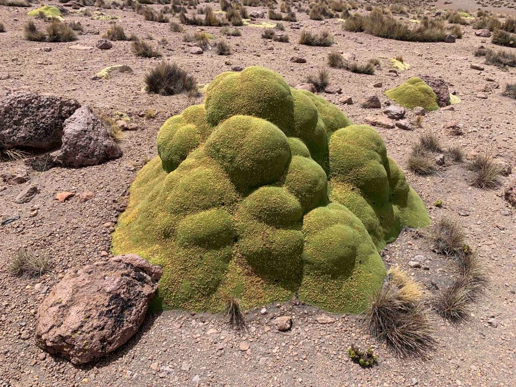 Immer weiter fuhren wir durch eine wunderschöne Landschaft nach Süden: Diese ist von großer Weite geprägt, in der die einzelnen Berge (oft Vulkane) sehr erhaben wirken. Ergänzt wird das durch bizarre Felsformationen und Pflanzen, die der Trockenheit standhalten wie Yareta, eine Art Moos, das ausschließlich auf Steinen wächst und den Einheimischen nicht nur als Brennstoff, sondern auch für medizinische Zwecke dient.