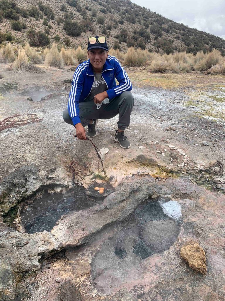 Durch seine Natürlichkeit ist der Park ein echtes Juwel, aber auch schwer zu erkunden. Wir waren wirklich froh, Ariel und sein Auto als Unterstützung zu haben, zumal unser junger Guide in Sajama aufgewachsen ist und sich dort perfekt auskennt. So wanderten wir gemeinsam zur Cris Lagune auf 4800 Metern im Grenzbereich zwischen Bolivien und Chile. Dabei erzählte Ariel uns allerlei Persönliches aus seiner Kindheit im Nationalpark, in der er noch zusammen mit seinem Vater Alpakas gehütet hat. Von daher kannte er auch Namen und Verwendung vieler der dort heimischen Pflanzen und zeigte uns den beliebten Trick, in den kleinen Geysiren auf dem Weg zur Lagune Eier zu kochen. – So leicht sind wir glücklich zu machen!
