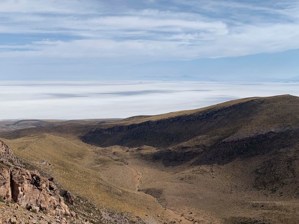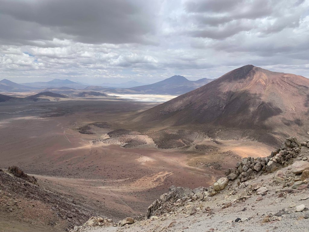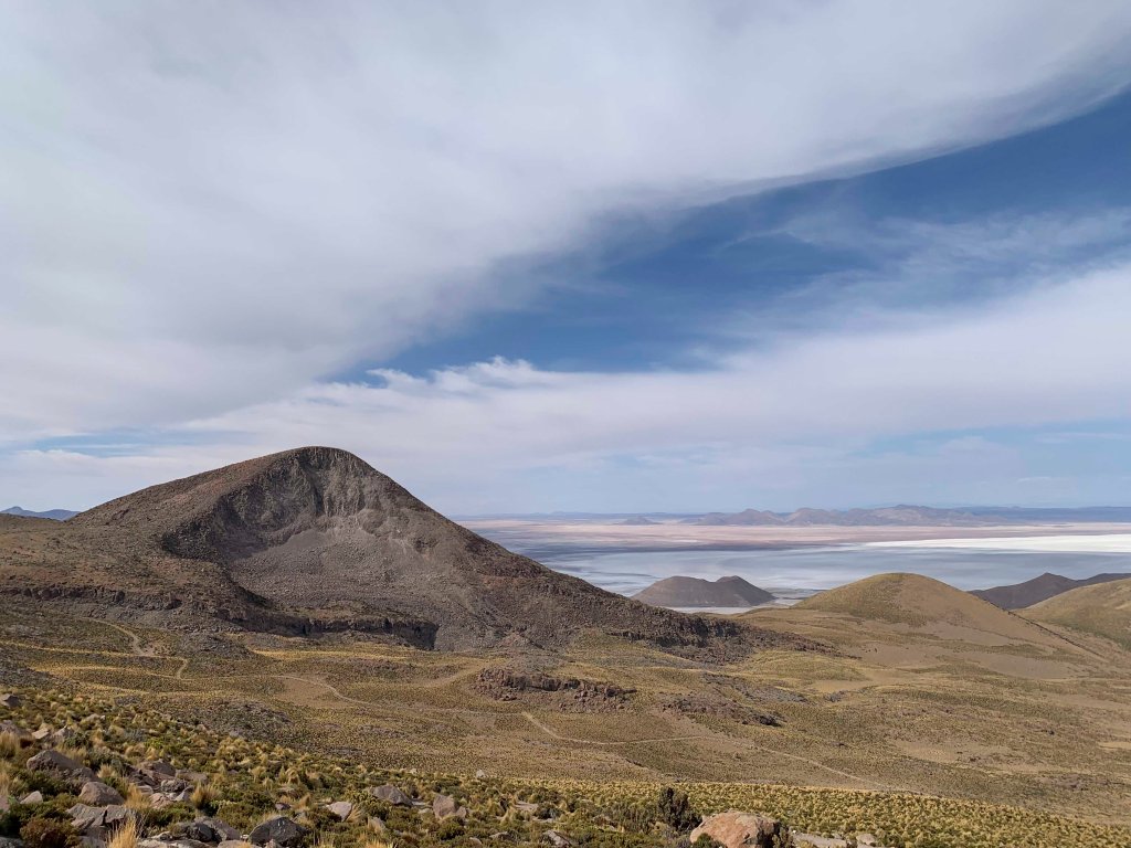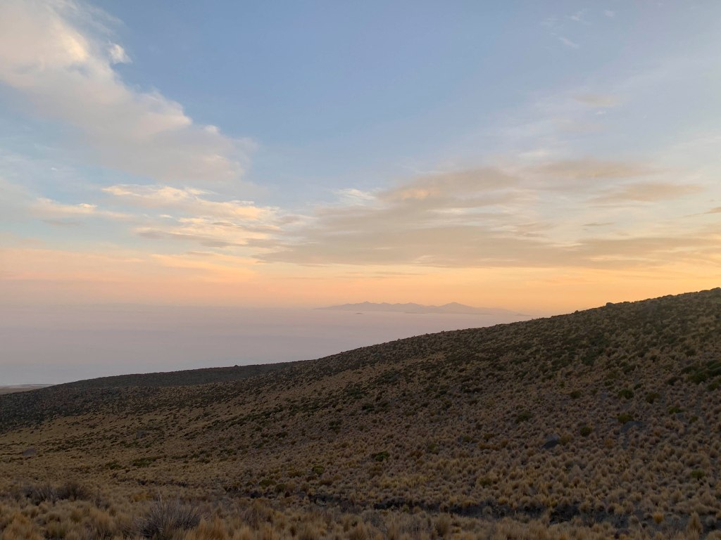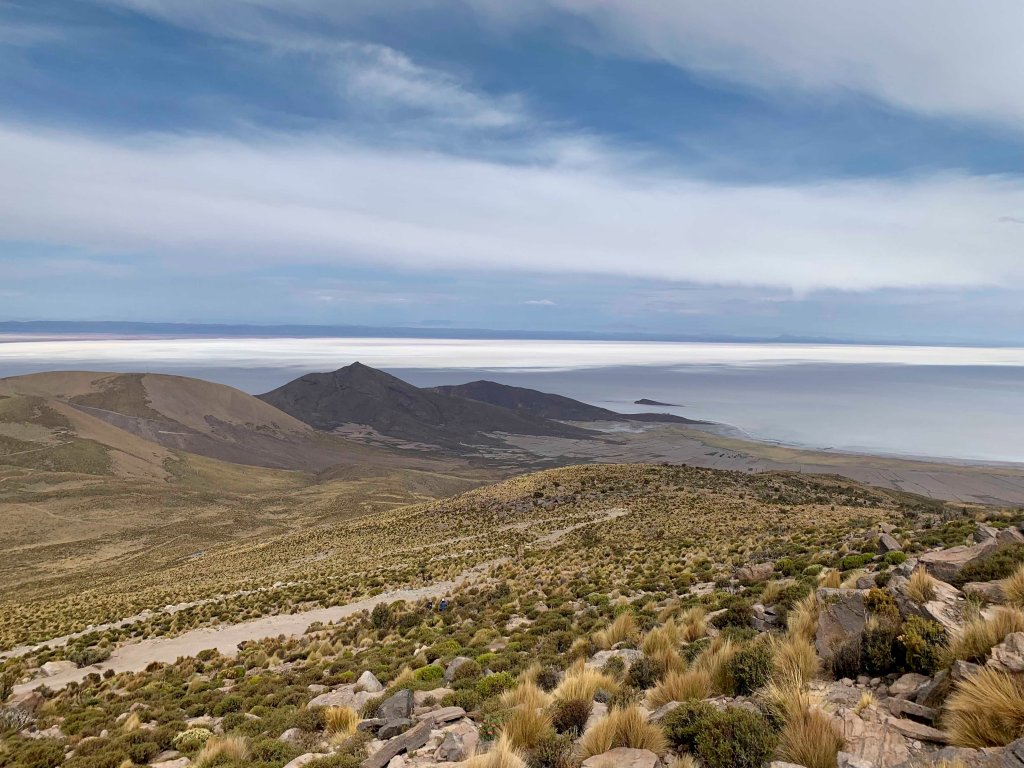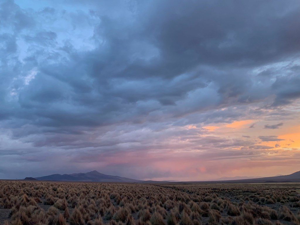 Dennoch machten wir am Nachmittag noch einen Ausflug auf einen Aussichtspunkt über den Tunupa, der zu einem kleinen Abenteuer wurde: Weil uns der kurze Spaziergang zum Aussichtspunkt noch nicht so richtig ausgelastet hatte, fragten wir Hugo, ob wir vom Vulkan hinunterwandern und uns unten wieder mit ihm und Arminda treffen könnten. Jedenfalls dachten wir, dass wir das gefragt hätten… Hugo verstand aber, dass wir eine Runde ins nächste Tal drehen und dann zurückkommen würden. So kam es, dass Stefan und ich zügig und energiegeladen ungefähr 1000 Höhenmeter über Stock und Stein hinunterstiegen, bis Hugo uns hechelnd einholte. Er teilte uns mit, dass es keinen Weg nach ganz unten gebe und wir wieder nach ganz oben umkehren müssten. Natürlich waren wir von diesem Plan alles andere als begeistert! Aber brav folgten wir Hugo quer über die Hänge zurück auf 4700 Meter, wobei es leider rasch dunkel wurde. Irgendwann, als wirklich niemand mehr Lust hatte, weiter im Finstern über Felsen zu stolpern und sich an stacheligen Büschen zu pieksen, fanden wir den Weg zum Jeep. Dort wartete Arminda besorgt auf uns und wir fuhren, mittlerweile wieder lachend, zurück nach Jirira in unsere Unterkunft. Schnell waren die Strapazen wieder vergessen und wir hatten im Nachhinein allerhand Spaß an unserem seltsamen Missverständnis.