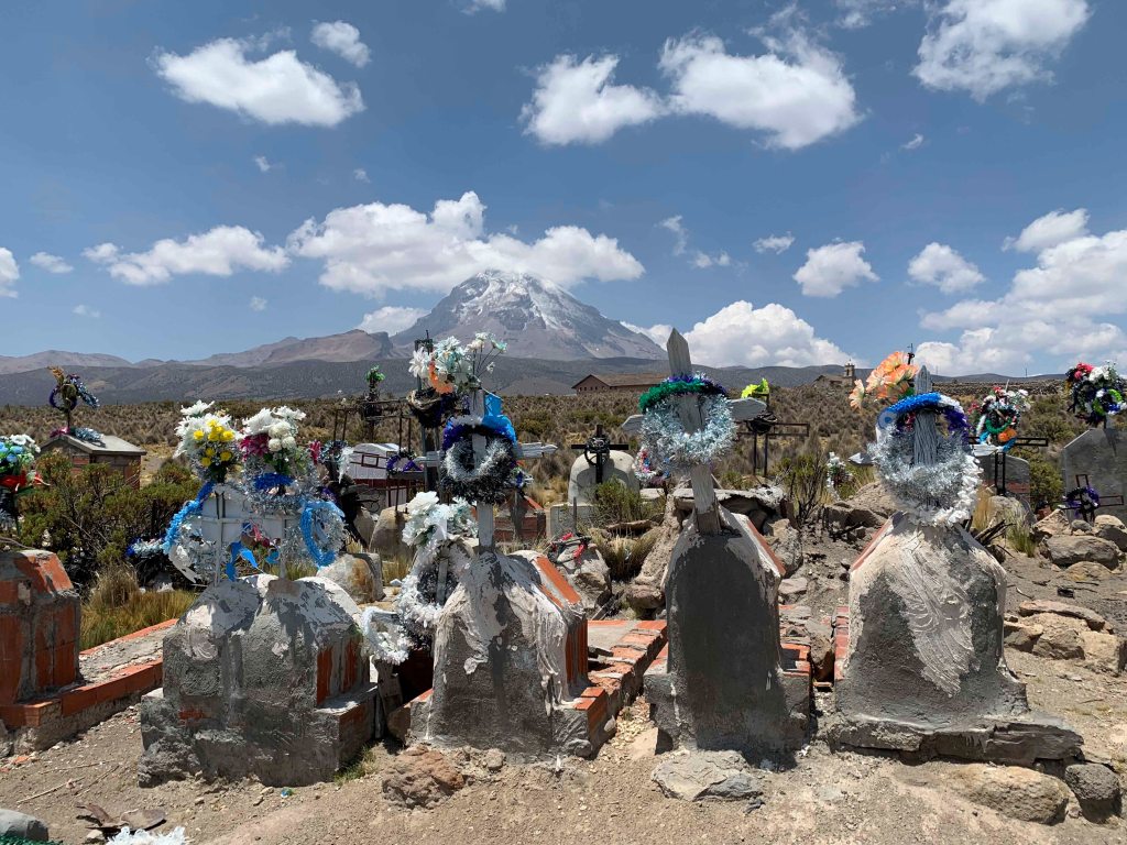 Am zweiten Tag war dann Marcelo, Ariels Vater, an der Reihe, uns als Guide Sehenswertes in Sajama zu zeigen. Das führte uns zu zwei Lagunen, deren Flamingos sich leider als ausgesprochen fotoscheu erwiesen. Auch haben die kleinen Gemeinden des Parks ein hübsches Kirchlein in schönster Lage, das wir besichtigten und neben dem ein malerischer Friedhof liegt. Und schließlich besuchten wir einen Aussichtspunkt, von dem aus eine weite Hochebene mit fast sämtlichen Alpakaherden Sajamas zu überblicken war. Hier erfuhren wir einiges über die Gestaltung des dörflichen Lebens in einer so weit verstreuten Gemeinde…