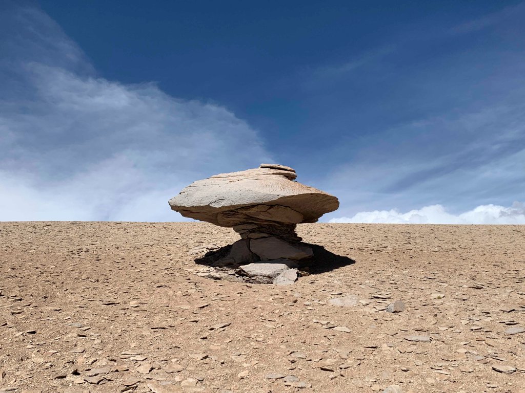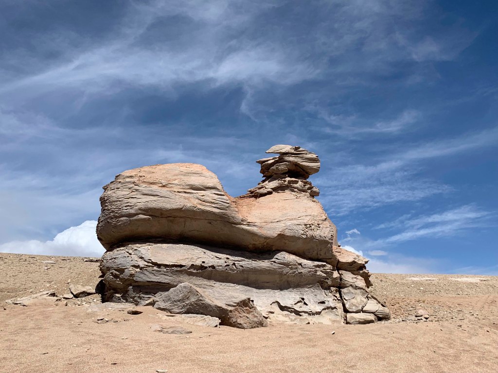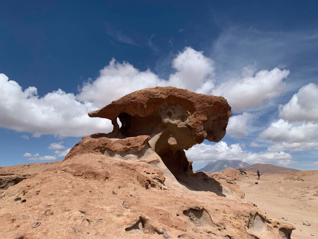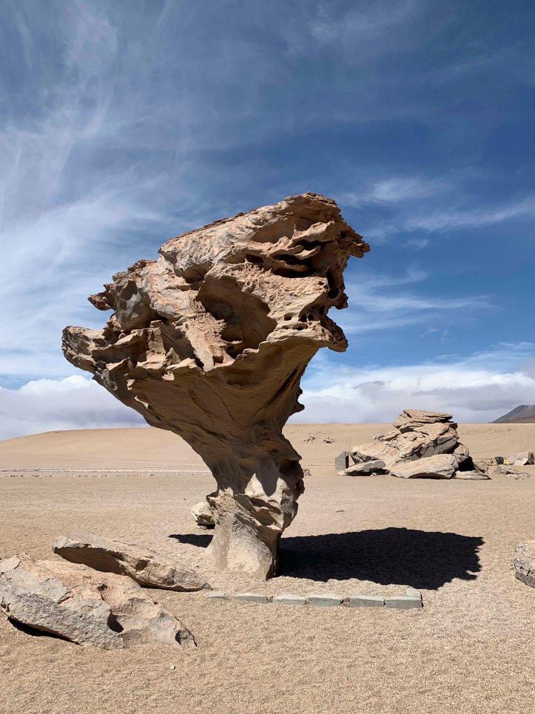 In Südbolivien zeigt sich immer wieder, dass die Natur eine großartige Künstlerin ist! Kaum hatten wir die Lagunen hinter uns gelassen, erwartete uns der nächste Höhepunkt: die Steinwüste Siloli. Hier hat der Wind gemeinsam mit schmirgelndem Sand unglaubliche Skulpturen wie den Steinbaum geformt. Es machte uns großen Spaß, zwischen den skurrilen Felsen herumzulaufen, wobei es durch den Wind überhaupt nicht so still und friedlich war, wie es auf den Bildern wirkt!