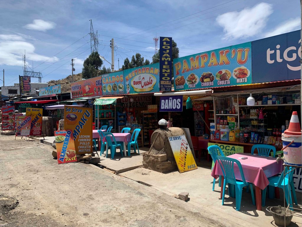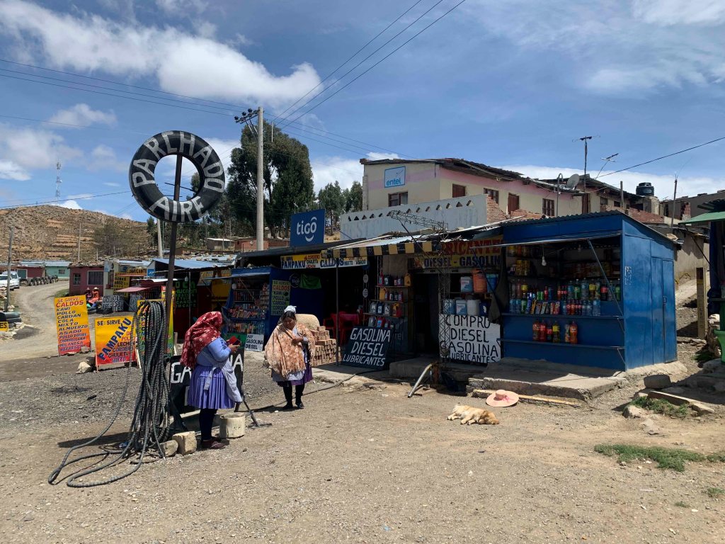 Im insgesamt sehr kargen bolivianischen Hochland staunt man über gelegentliche plötzliche Farbtupfer: Beispielsweise an einem Pass drängen sich dann gleich zehn oder mehr kleine Laden-Restaurants mit Toilette im hintersten Hinterhof, die heftig um Kundschaft werben. Das Gleiche begegnete uns an Mautstellen, wo eine ganze Reihe von Getränkebuden mit demselben Sortiment ihre Waren anbieten. – Dafür kann es sein, dass dann auf den nächsten hundert Kilometern gar nichts kommt…