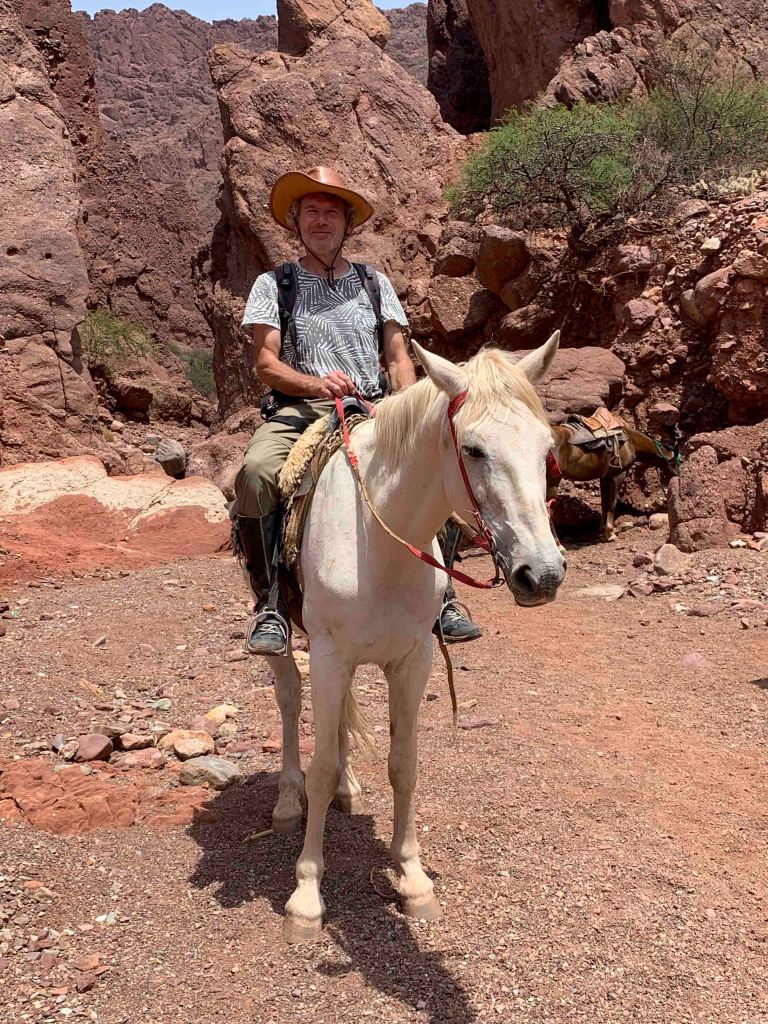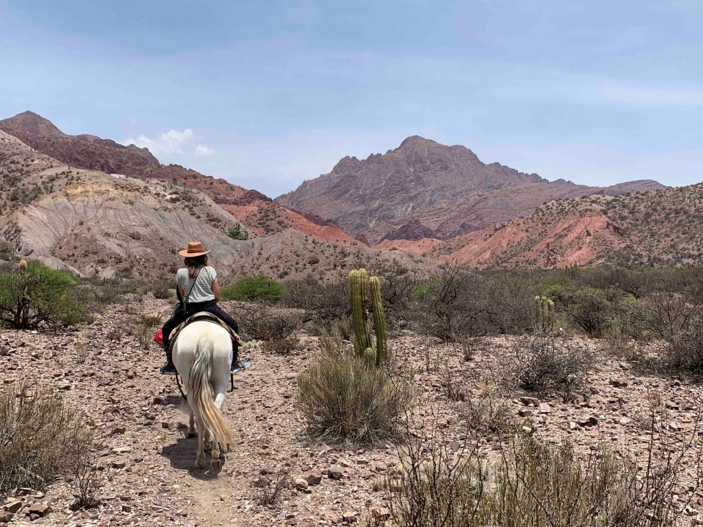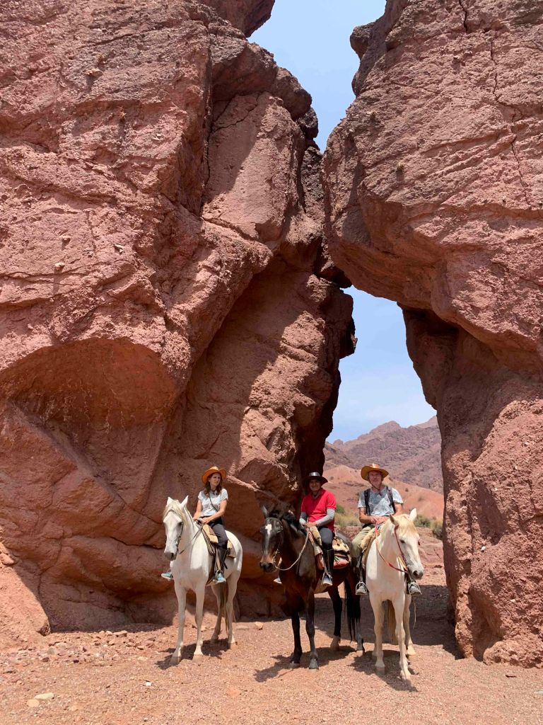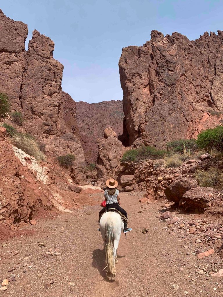 Da vor allem die roten Felsen uns an den Südwesten der USA erinnerten, dachten wir uns, warum nicht mal ein bisschen Wilder Westen spielen? Also nutzten wir am zweiten Tag die Möglichkeit für einen mehrstündigen Ausritt zur Puerta del Diablo und in den Cañon de Duende. Die Schluchten waren wie geschaffen dafür, sie auf dem Pferderücken zu erkunden. Unsere Pferde konnten sich zum Glück gut leiden, sodass es ein entspannter Ausflug für alle wurde und auch Hugo seinen ersten Ausritt genießen konnte. Am Nachmittag fanden wir es dann herrlich, mal ein Hotel mit Pool zu haben, in dem wir uns gemütlich von Hitze und Staub erholten!
