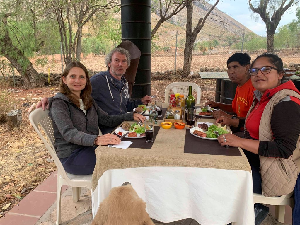 Nach den heißen Wanderungen war es super angenehm, sich im Garten unserer Unterkunft im Dorf Torotoro auszuruhen, und am letzten Tag konnten wir als gemütliches Highlight einen Grillabend mit Sandra und Marcelo genießen, unterstützt von der netten Mitarbeiterin der Villa Etelvina. Dabei kam auch der Hund nicht zu kurz – dank seines unaufdringlichen Hypnoseblicks…