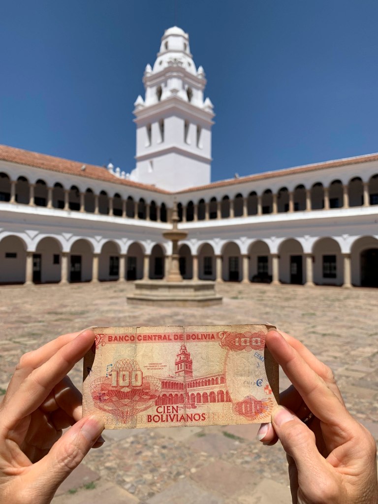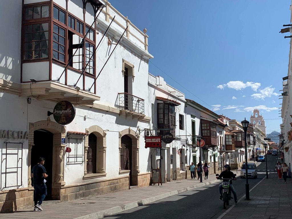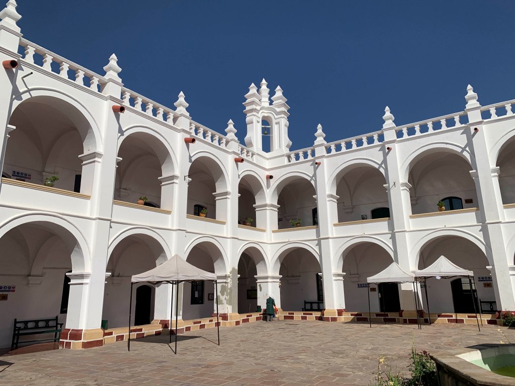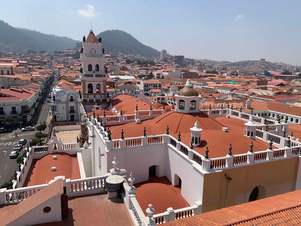 Wir hatten bis hierher an bolivianischen Städten La Paz und Oruro kennen gelernt – die eine sehr spannend, die andere völlig uninteressant. Cochabamba konnten wir nur streifen, aber nun bot sich mit Sucre eine neue Gelegenheit, unser Spektrum zu erweitern. Und das war sehr lohnenswert! Sucre ist zum einen die konstitutionelle Hauptstadt Boliviens und Sitz des Obersten Gerichtshofes, zum anderen, wie auch Arequipa in Peru, eine weiße Stadt. Fast der gesamte Stadtkern ist UNESCO-Weltkulturerbe, was hier auch in sehr positiver Weise als Auftrag gesehen wird: Es gibt hauptsächlich schön restaurierte Gebäude, alles wirkt gepflegt und viele Häuser weisen zudem kleine Infotafeln auf, sodass man als Besucher auch ohne Führung etwas über deren frühere Nutzung und ehemalige Bewohner erfährt. Außerdem kann man verschiedene Dächer und Türme besteigen, eine unserer Lieblingsbeschäftigungen, weil man immer wieder neue Ausblicke erhascht. Oder man trifft nette Leute: Im Turm von San Miguel (dem Gebäude auf der 100-Boliviano-Note) befindet sich ein Café, wo wir zwischen Snacks und Ausschau in alle Richtungen Halten ein deutsches Paar kennen gelernt haben, das für lange Zeit auf Reisen war und ebenfalls bloggte – es war richtig schön, mal so zu quatschen.