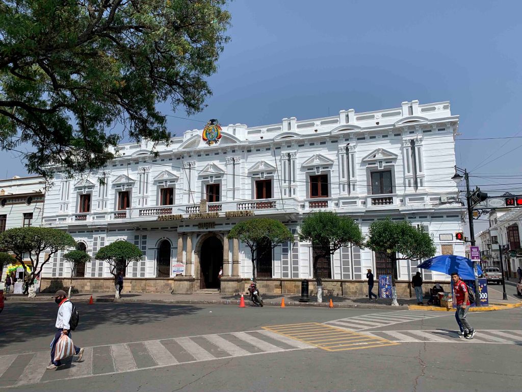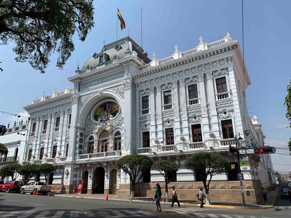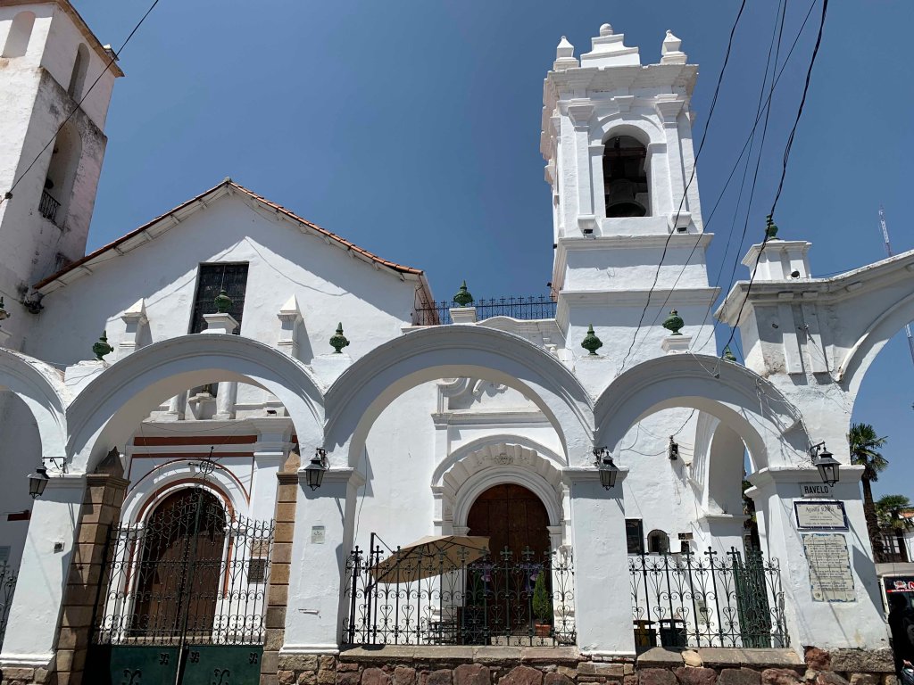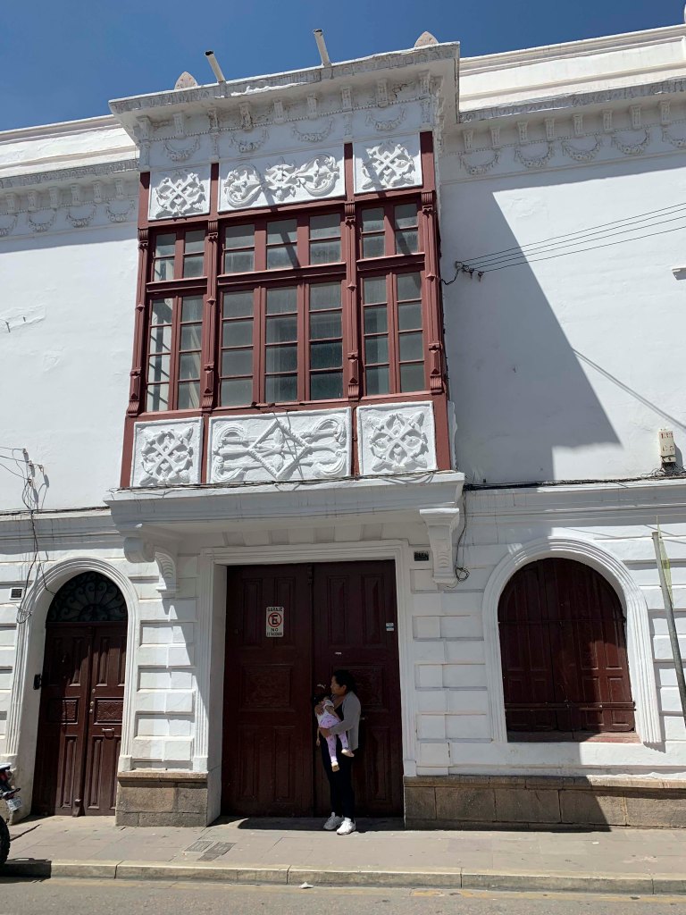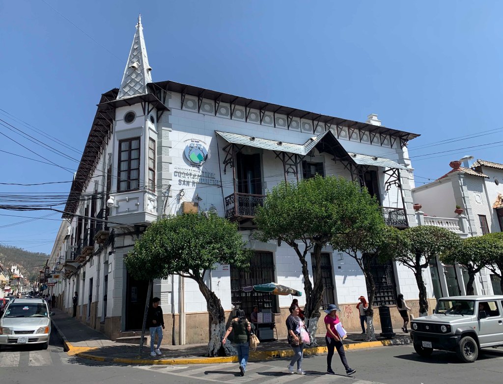 Wir hatten bis hierher an bolivianischen Städten La Paz und Oruro kennen gelernt – die eine sehr spannend, die andere völlig uninteressant. Cochabamba konnten wir nur streifen, aber nun bot sich mit Sucre eine neue Gelegenheit, unser Spektrum zu erweitern. Und das war sehr lohnenswert! Sucre ist zum einen die konstitutionelle Hauptstadt Boliviens und Sitz des Obersten Gerichtshofes, zum anderen, wie auch Arequipa in Peru, eine weiße Stadt. Fast der gesamte Stadtkern ist UNESCO-Weltkulturerbe, was hier auch in sehr positiver Weise als Auftrag gesehen wird: Es gibt hauptsächlich schön restaurierte Gebäude, alles wirkt gepflegt und viele Häuser weisen zudem kleine Infotafeln auf, sodass man als Besucher auch ohne Führung etwas über deren frühere Nutzung und ehemalige Bewohner erfährt. Außerdem kann man verschiedene Dächer und Türme besteigen, eine unserer Lieblingsbeschäftigungen, weil man immer wieder neue Ausblicke erhascht. Oder man trifft nette Leute: Im Turm von San Miguel (dem Gebäude auf der 100-Boliviano-Note) befindet sich ein Café, wo wir zwischen Snacks und Ausschau in alle Richtungen Halten ein deutsches Paar kennen gelernt haben, das für lange Zeit auf Reisen war und ebenfalls bloggte – es war richtig schön, mal so zu quatschen.