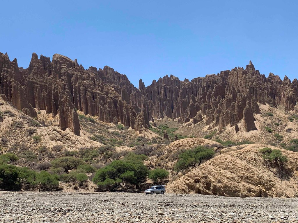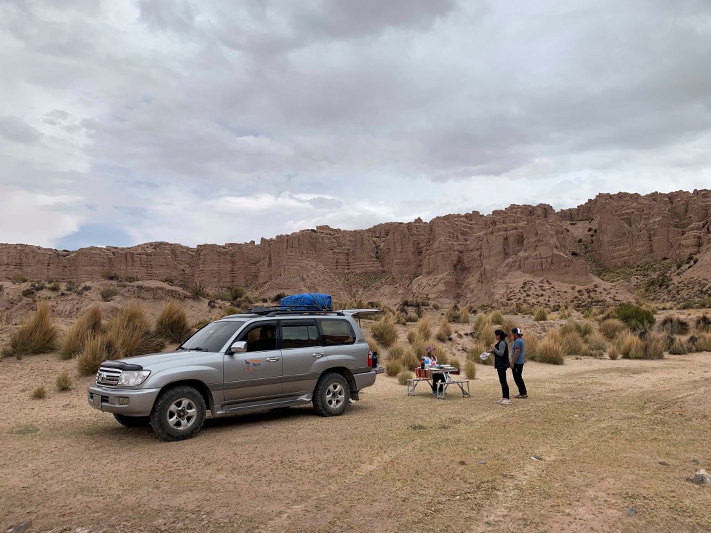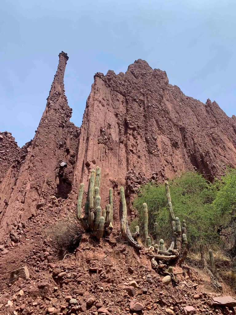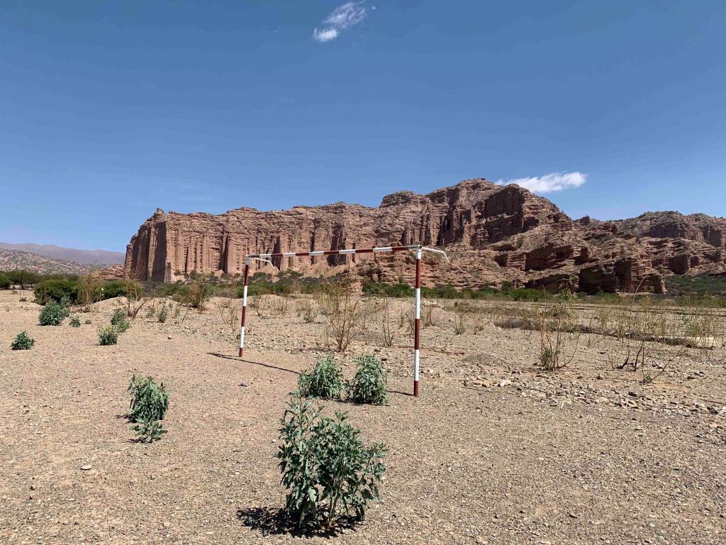 Unsere nächste Station war die kleine südbolivianische Stadt Tupiza, die vor allem als Ausgangspunkt für Ausflüge in die großartige Umgebung dient. Die Gegend liegt weniger hoch (2850 Meter) und ist weitgehend von Halbwüstencharakter geprägt. Es gibt unglaublich viele verschiedene Gesteinsformationen, die oft an die Skyline von Städten erinnern oder wie von Menschenhand geschaffene Burgen aussehen. Außerdem haben wir uns gleich beim ersten Ausflug in die vielen großen Kakteen verliebt. – Und uns gefragt, ob auf einem Fußballplatz mitten im supertrockenen Niemandsland wirklich auch gekickt wird… Zusammen mit unserem Guide Hugo und seiner Frau und Köchin Arminda bewunderten wir die erstaunlichen Landschaften rund um einen trockenen Flusslauf und genossen unter einem alten Queñoa-Baum ein fürstliches Picknick.