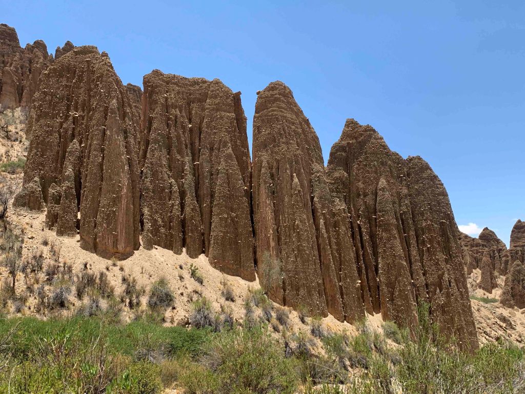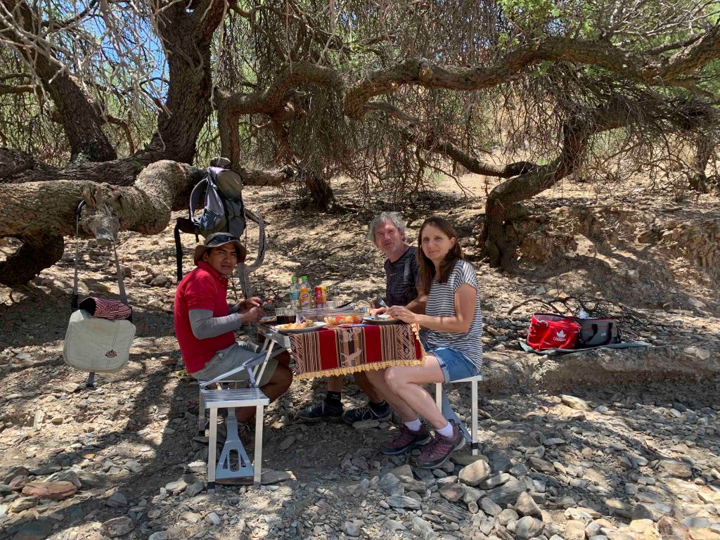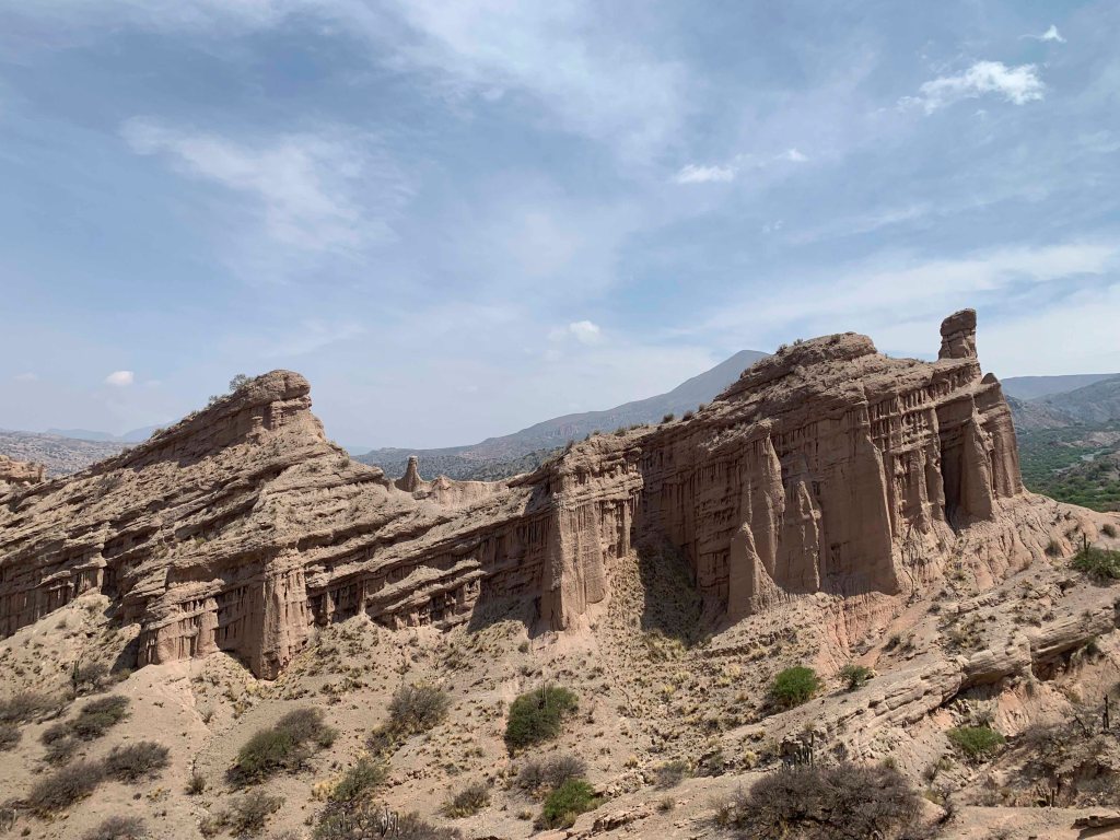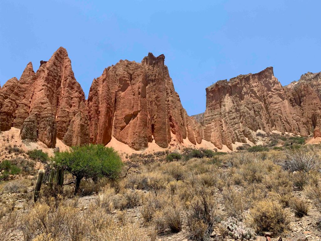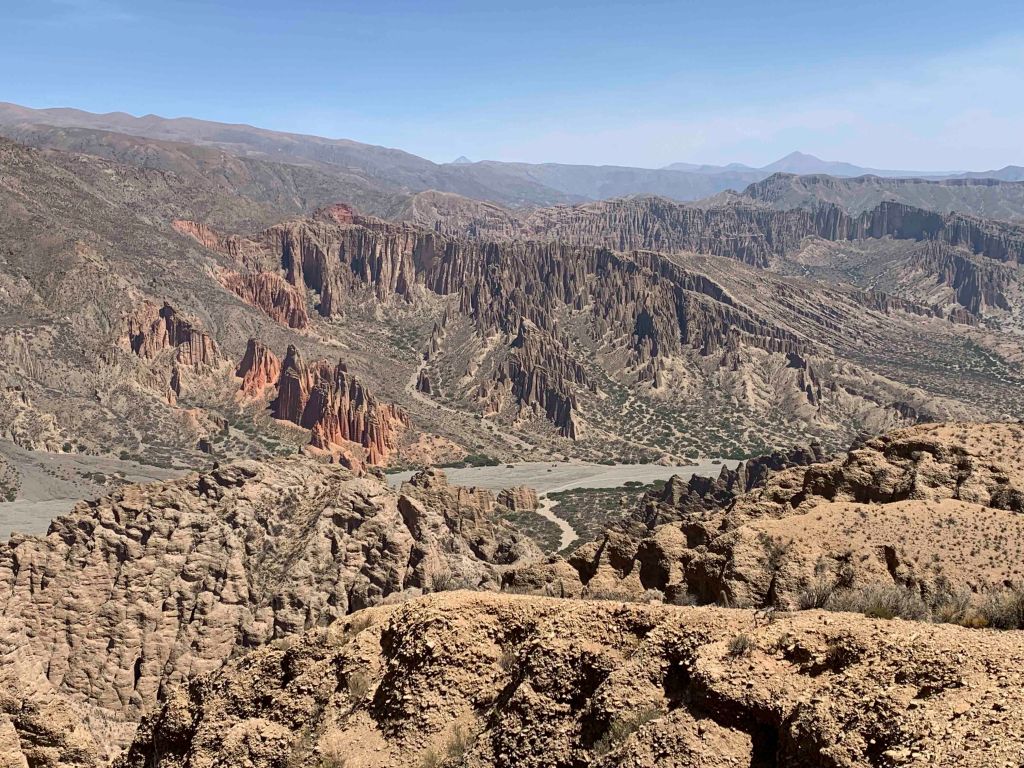 Unsere nächste Station war die kleine südbolivianische Stadt Tupiza, die vor allem als Ausgangspunkt für Ausflüge in die großartige Umgebung dient. Die Gegend liegt weniger hoch (2850 Meter) und ist weitgehend von Halbwüstencharakter geprägt. Es gibt unglaublich viele verschiedene Gesteinsformationen, die oft an die Skyline von Städten erinnern oder wie von Menschenhand geschaffene Burgen aussehen. Außerdem haben wir uns gleich beim ersten Ausflug in die vielen großen Kakteen verliebt. – Und uns gefragt, ob auf einem Fußballplatz mitten im supertrockenen Niemandsland wirklich auch gekickt wird… Zusammen mit unserem Guide Hugo und seiner Frau und Köchin Arminda bewunderten wir die erstaunlichen Landschaften rund um einen trockenen Flusslauf und genossen unter einem alten Queñoa-Baum ein fürstliches Picknick.