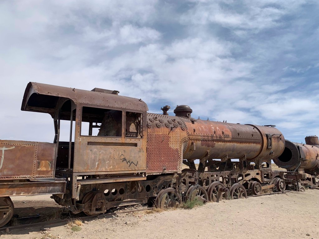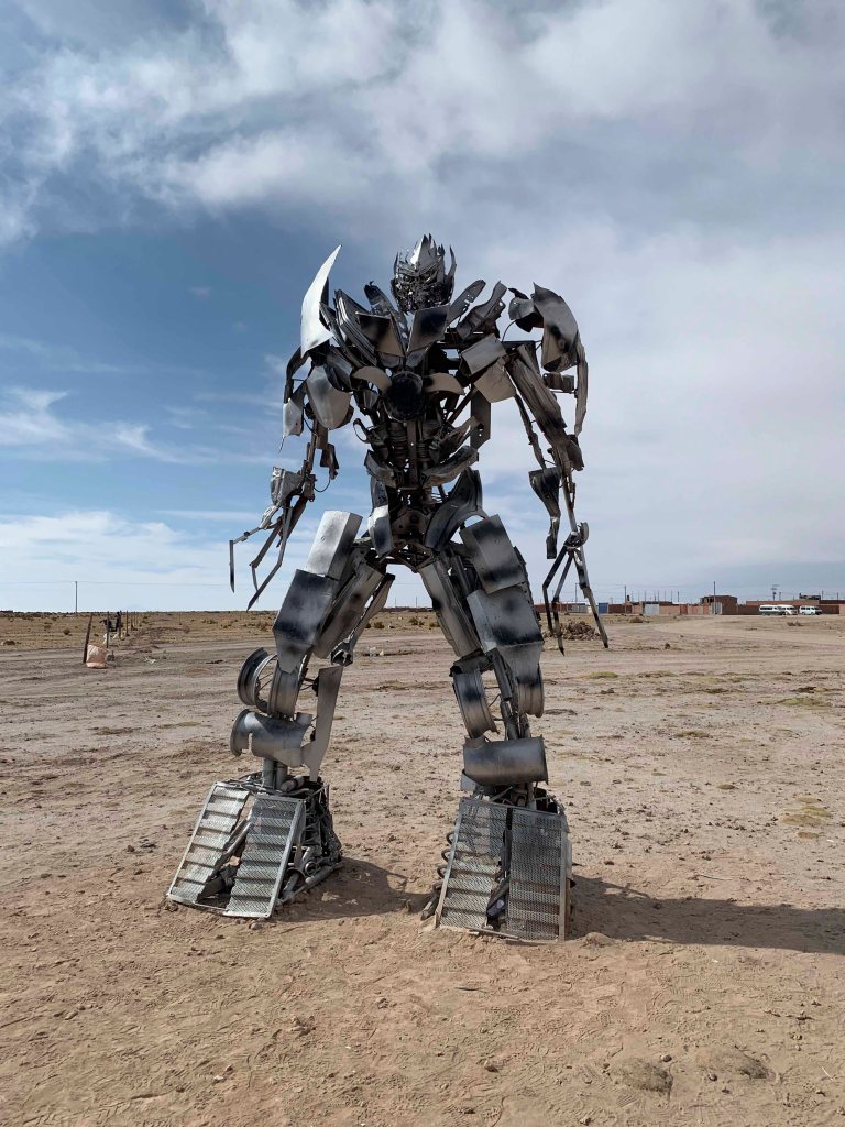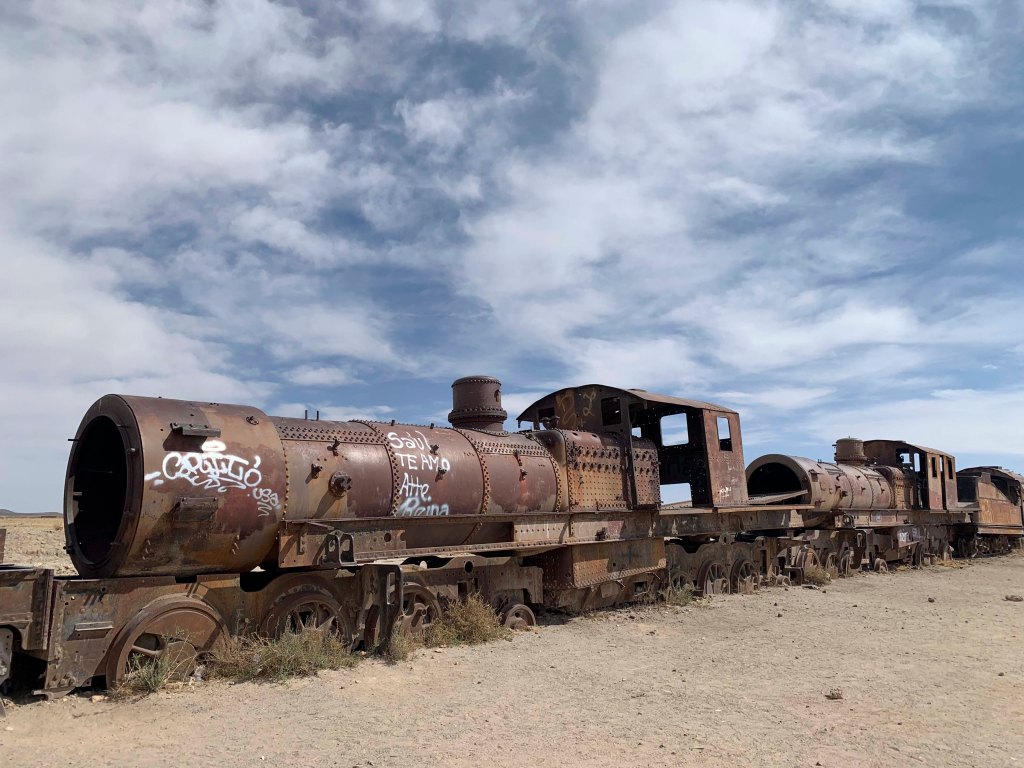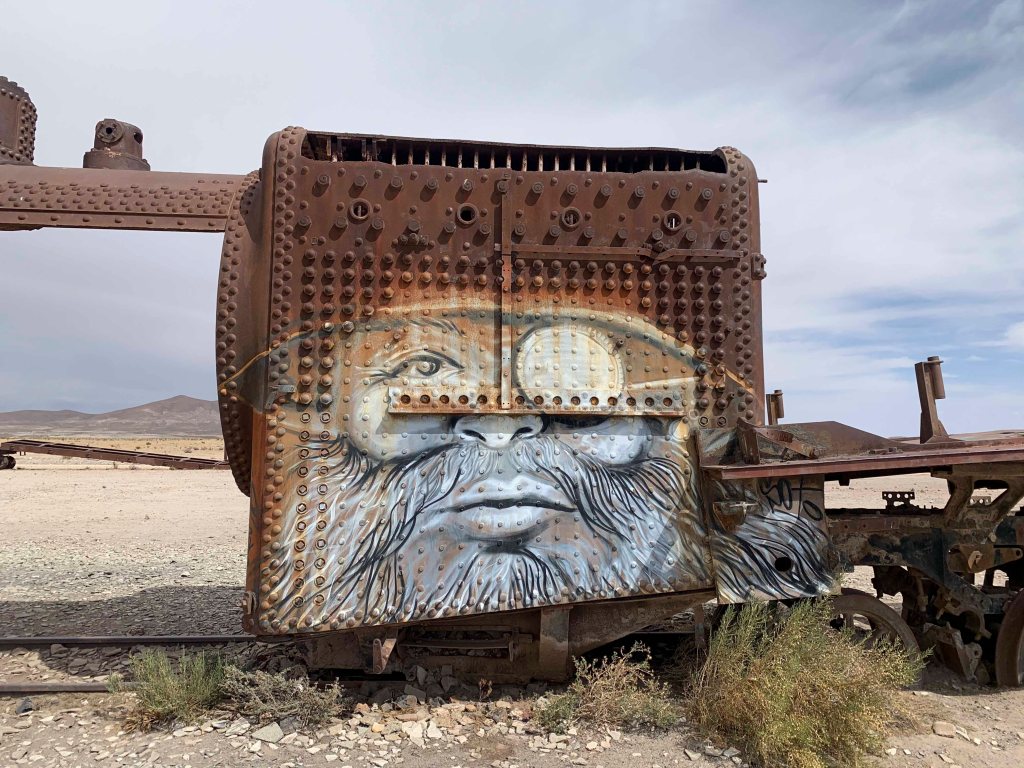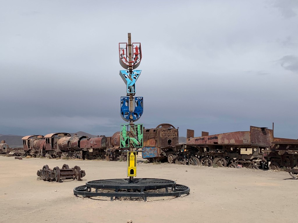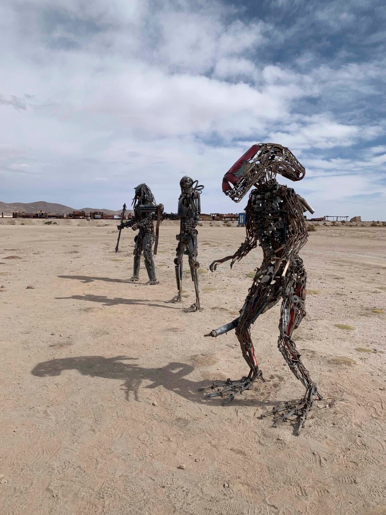 Ein sehr eindrucksvoller Halt war für uns der Eisenbahnfriedhof von Uyuni. Dieser stammt daher, dass im ausgehenden 19. Jahrhundert in der Gegend um den Salzsee viele Minen entstanden, aus denen die gewonnenen Mineralien und Edelmetalle per Eisenbahn an die Pazifikküste transportiert wurden. Als dann ab 1940 die meisten Minen aufgegeben wurden, benötigte man auch die Güterzüge nicht mehr, sie wurden dem Verfall preisgegeben. Das geschieht zum Glück sehr langsam und sehr malerisch, der Ort wirkt wie ein Freilichtmuseum und inspiriert offenbar auch Künstler zu modernen Werken, die Wächter für die alten Züge sein könnten.