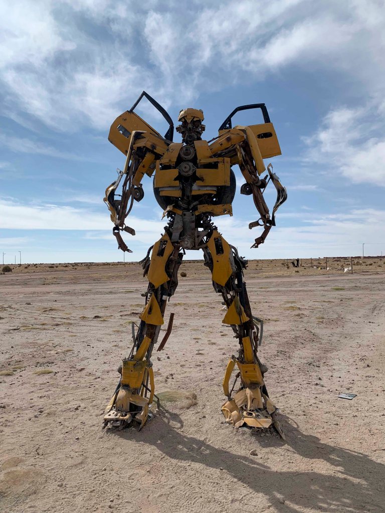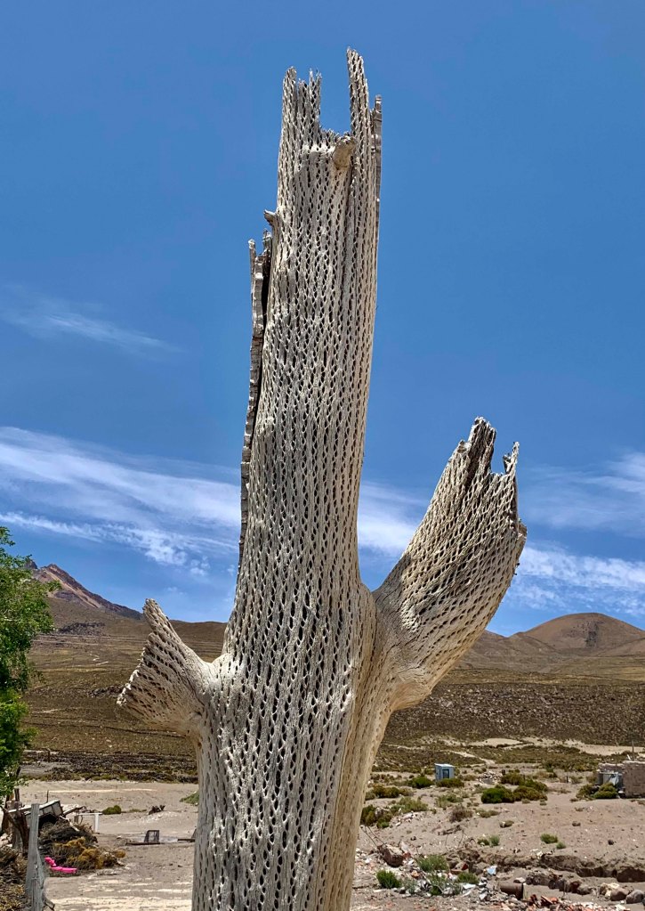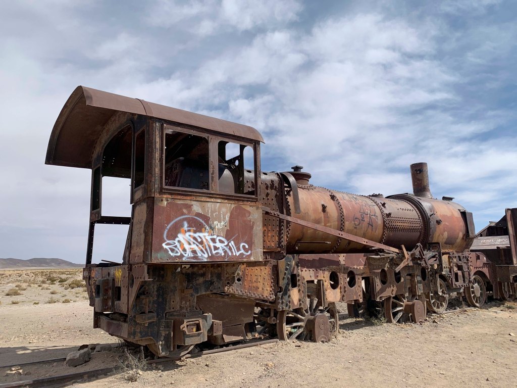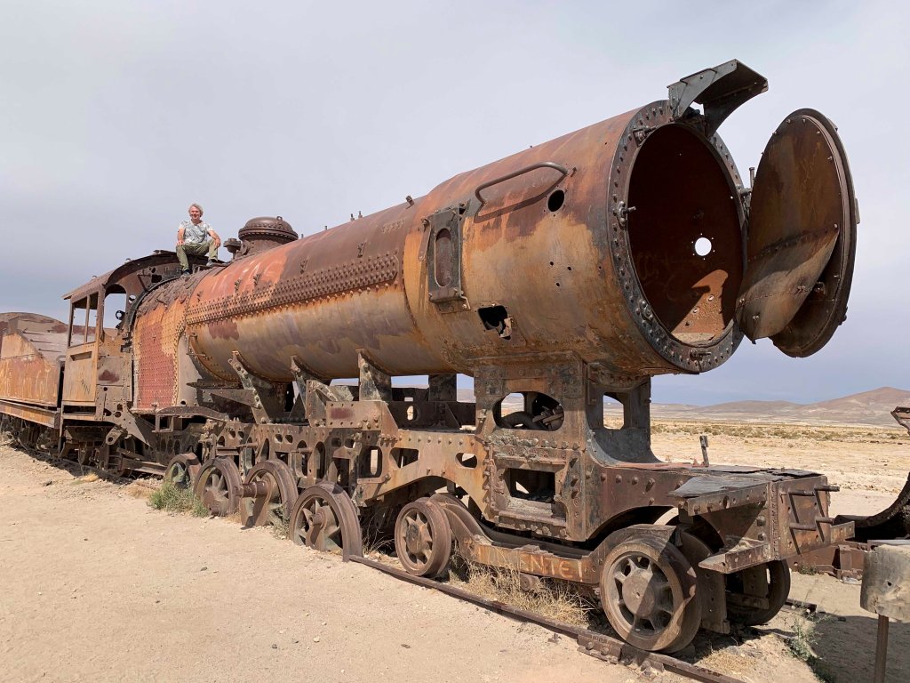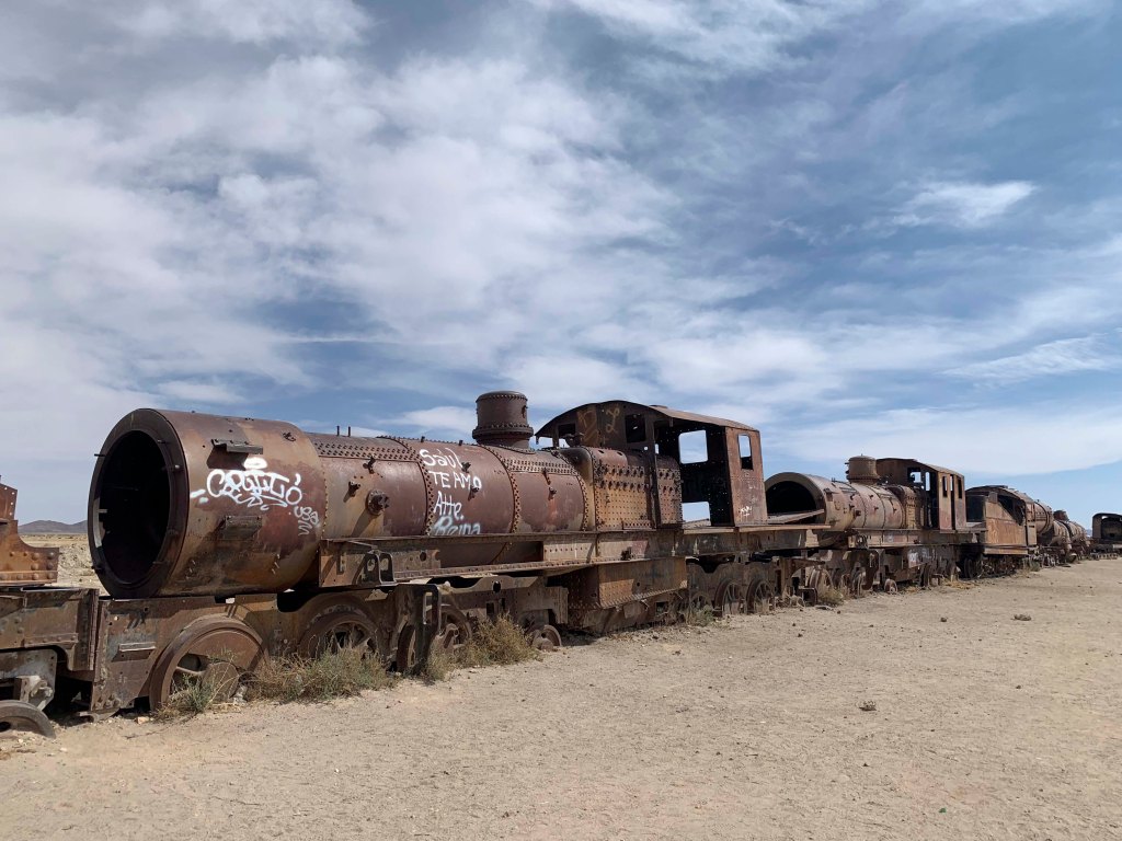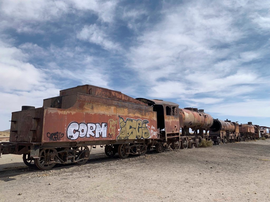 Ein sehr eindrucksvoller Halt war für uns der Eisenbahnfriedhof von Uyuni. Dieser stammt daher, dass im ausgehenden 19. Jahrhundert in der Gegend um den Salzsee viele Minen entstanden, aus denen die gewonnenen Mineralien und Edelmetalle per Eisenbahn an die Pazifikküste transportiert wurden. Als dann ab 1940 die meisten Minen aufgegeben wurden, benötigte man auch die Güterzüge nicht mehr, sie wurden dem Verfall preisgegeben. Das geschieht zum Glück sehr langsam und sehr malerisch, der Ort wirkt wie ein Freilichtmuseum und inspiriert offenbar auch Künstler zu modernen Werken, die Wächter für die alten Züge sein könnten.
