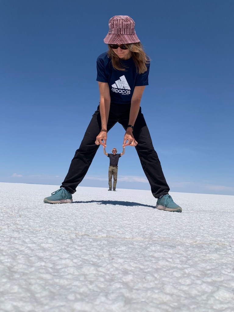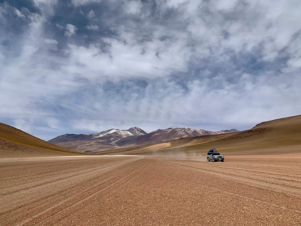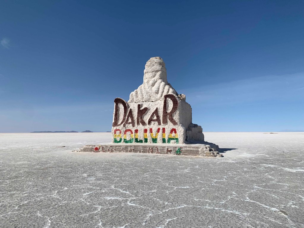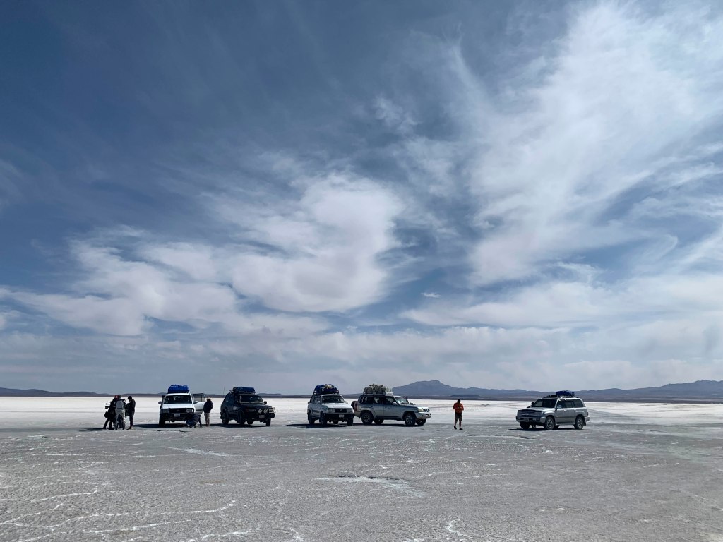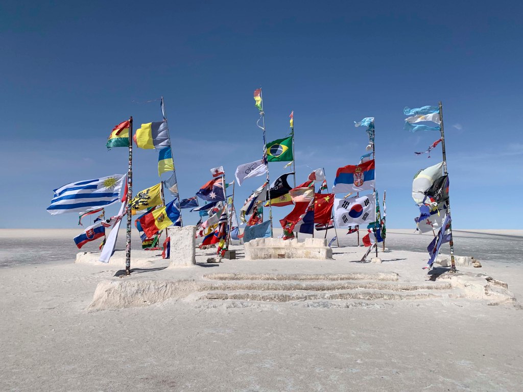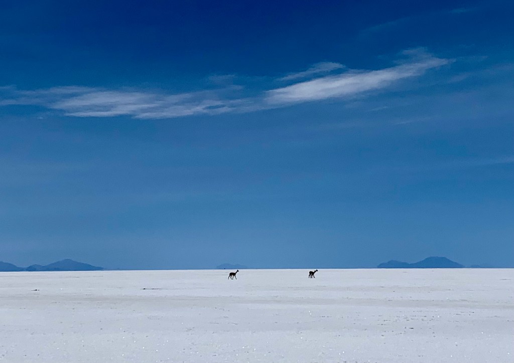 Der nächste Tag stand dann ganz im Zeichen der riesigen weißen Salzfläche! Wenn am Ufer noch viele Verunreinigungen dafür sorgen, dass die ersten Eindrücke eher bräunlich sind, zeigt sich bald nur noch blendendes Weiß von ungeheuer großem Ausmaß. Uns fiel vor allem auf, dass man Entfernungen gar nicht einschätzen konnte. Ein paarmal dachten wir, ein Ziel nicht weit vor uns zu haben, und staunten, wie lange man doch noch fahren musste! Schöne Abwechslungen im weiten Weiß bieten die bunten Flaggen und das Erinnerungsmal der Rallye Paris Dakar von 2014 sowie Vicuñas, die zum Salzlecken auf den See kommen. Ob auch Hugo ab und zu davon träumt, mit seinem Jeep einfach mal immer weiter zu fahren?