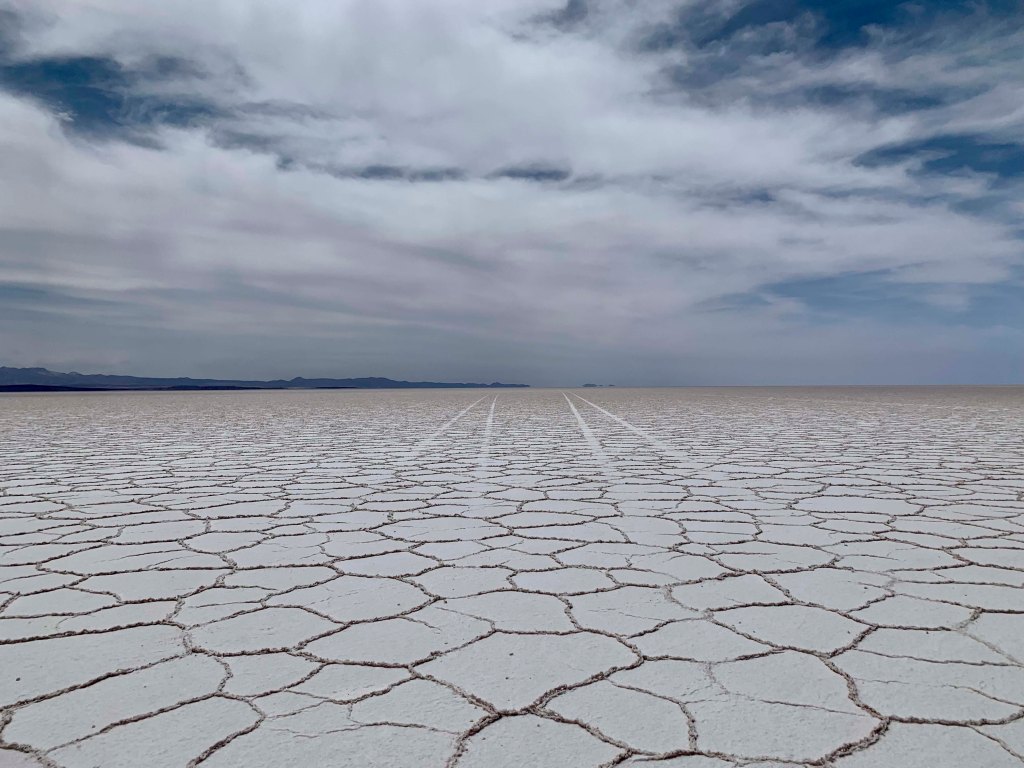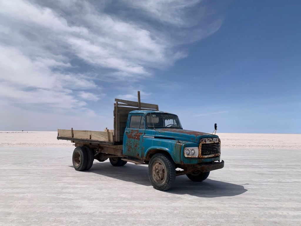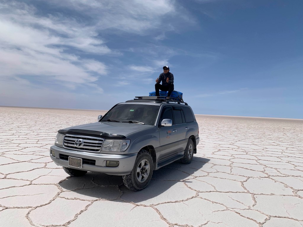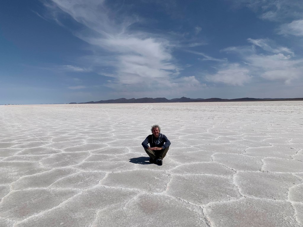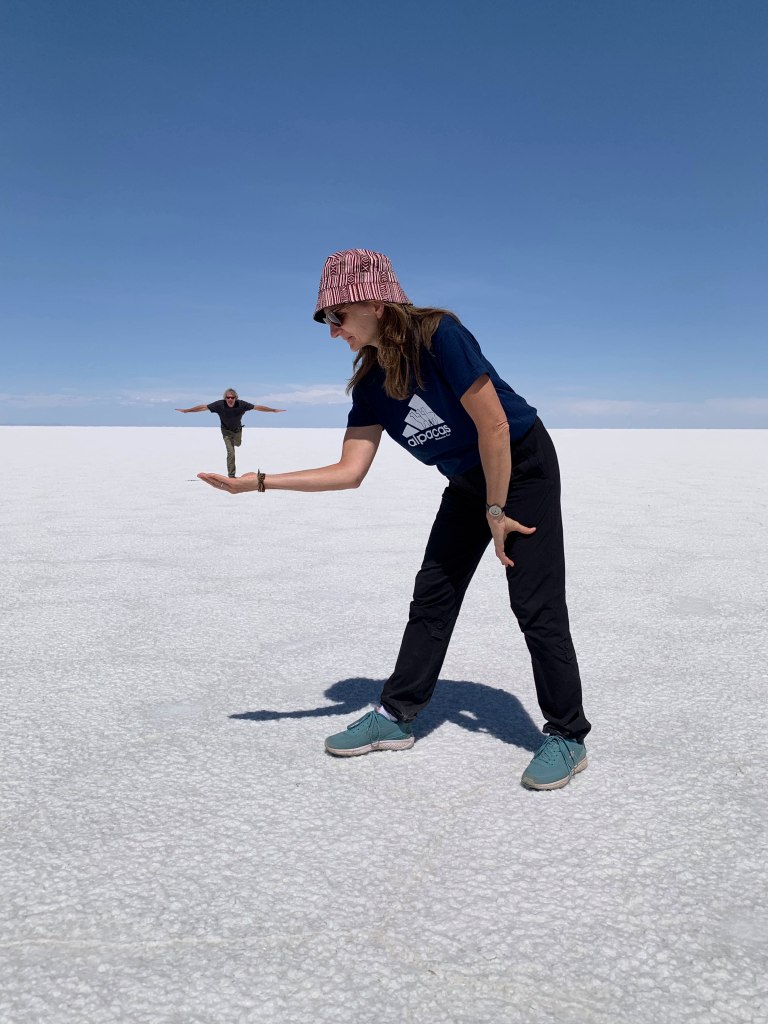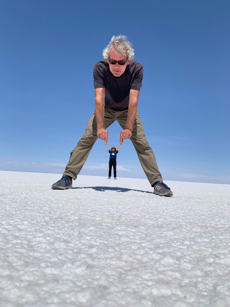 Der nächste Tag stand dann ganz im Zeichen der riesigen weißen Salzfläche! Wenn am Ufer noch viele Verunreinigungen dafür sorgen, dass die ersten Eindrücke eher bräunlich sind, zeigt sich bald nur noch blendendes Weiß von ungeheuer großem Ausmaß. Uns fiel vor allem auf, dass man Entfernungen gar nicht einschätzen konnte. Ein paarmal dachten wir, ein Ziel nicht weit vor uns zu haben, und staunten, wie lange man doch noch fahren musste! Schöne Abwechslungen im weiten Weiß bieten die bunten Flaggen und das Erinnerungsmal der Rallye Paris Dakar von 2014 sowie Vicuñas, die zum Salzlecken auf den See kommen. Ob auch Hugo ab und zu davon träumt, mit seinem Jeep einfach mal immer weiter zu fahren?