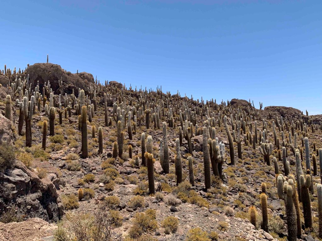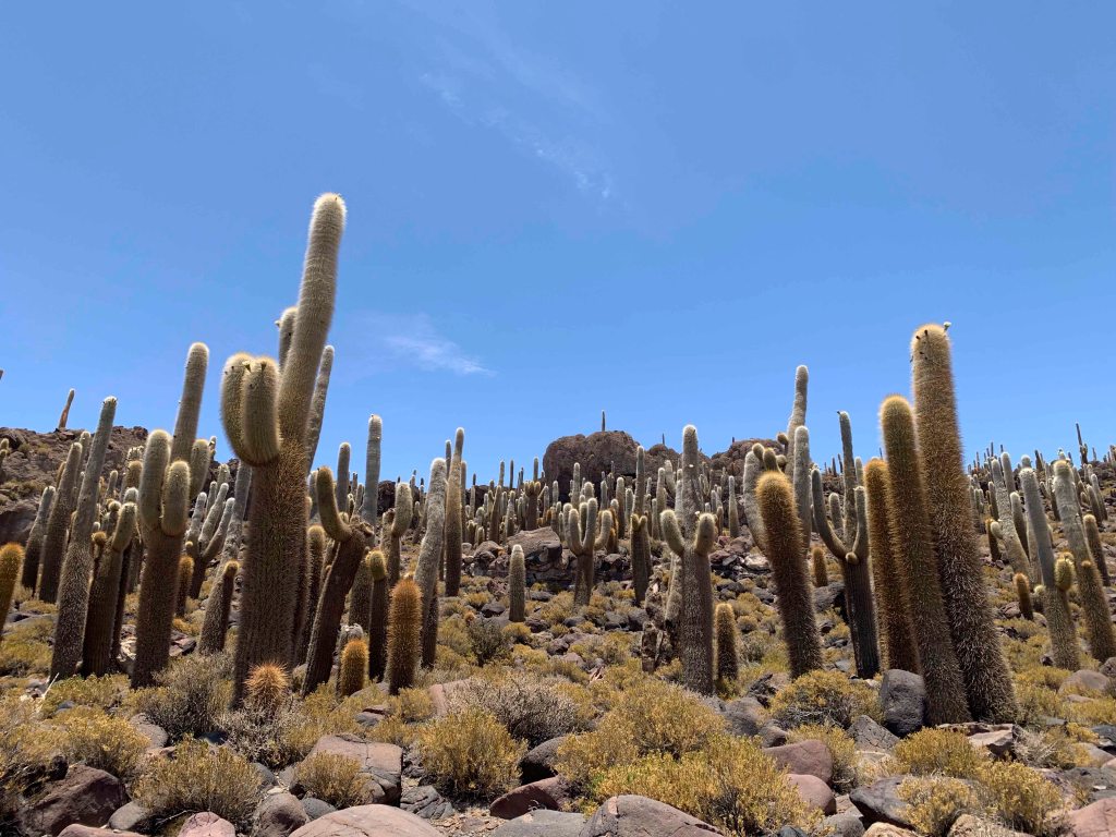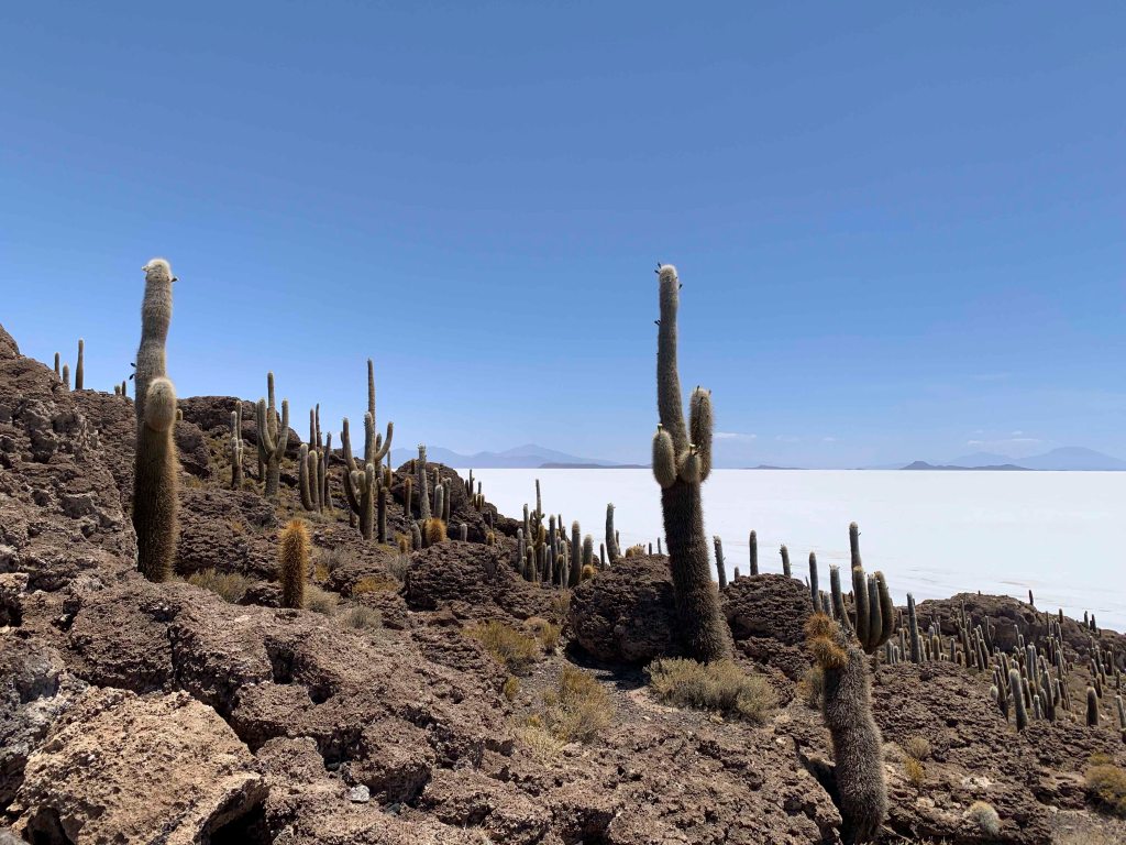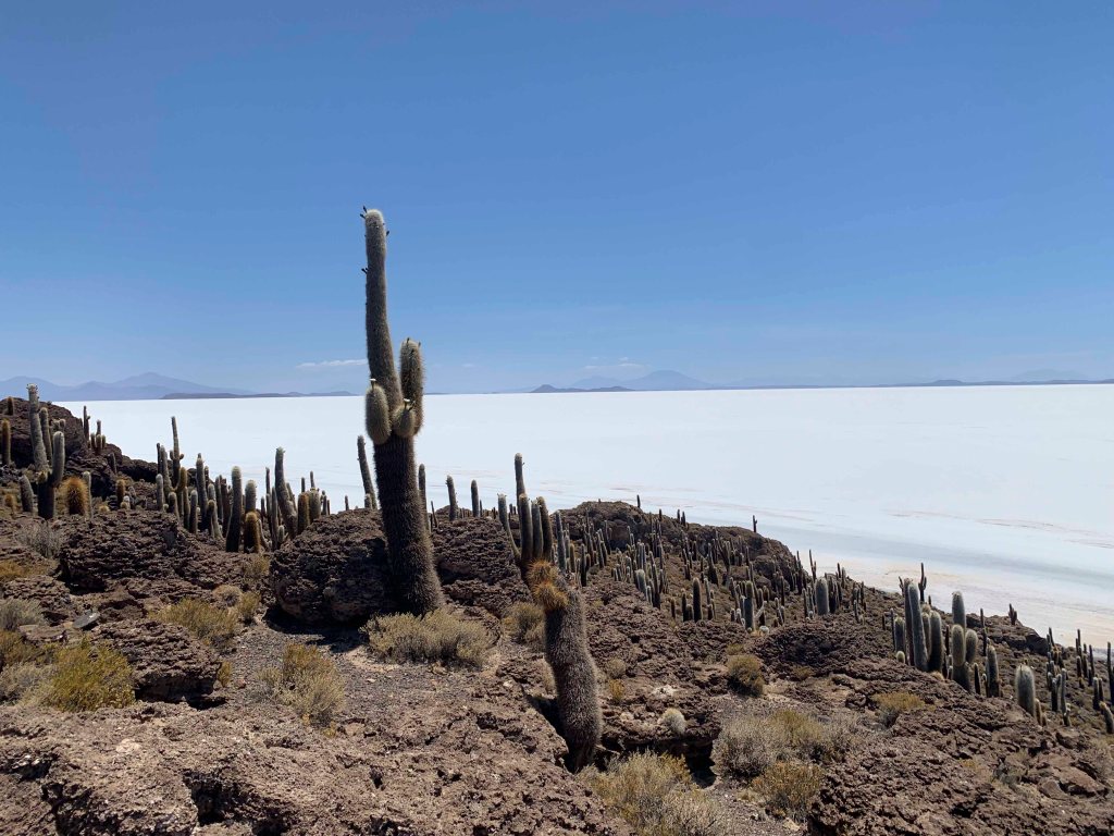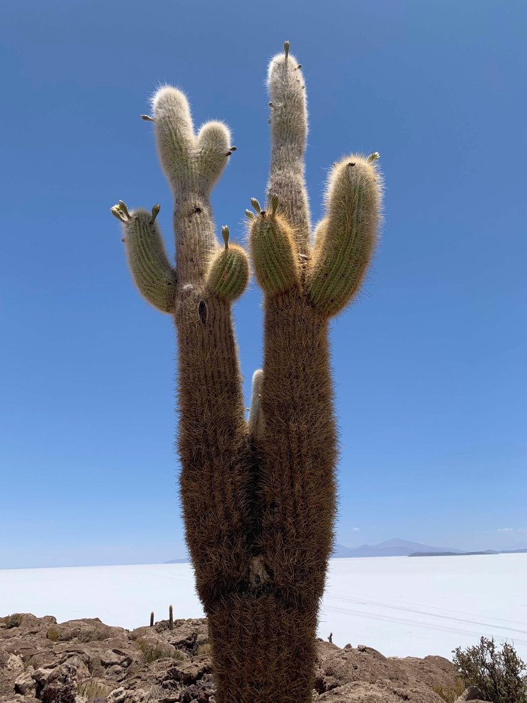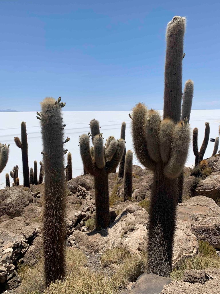 Ein weiteres Highlight auf dem Uyuni ist die Kaktusinsel Inka Wasi, das Haus des Inka. Auf der Felseninsel stehen Hunderte von Riesenkakteen in unterschiedlichsten Formen und als wir dort waren, begann gerade die Kaktusblüte. Von etwas weiter weg wirken die „Arme“ dieser Gewächse manchmal ganz kuschelig, bei näherer Betrachtung verliert man allerdings jede Lust, sie zu berühren. Ein besonderes Erlebnis war im Anschluss an den Spaziergang das Picknick mitten auf dem Salzsee!