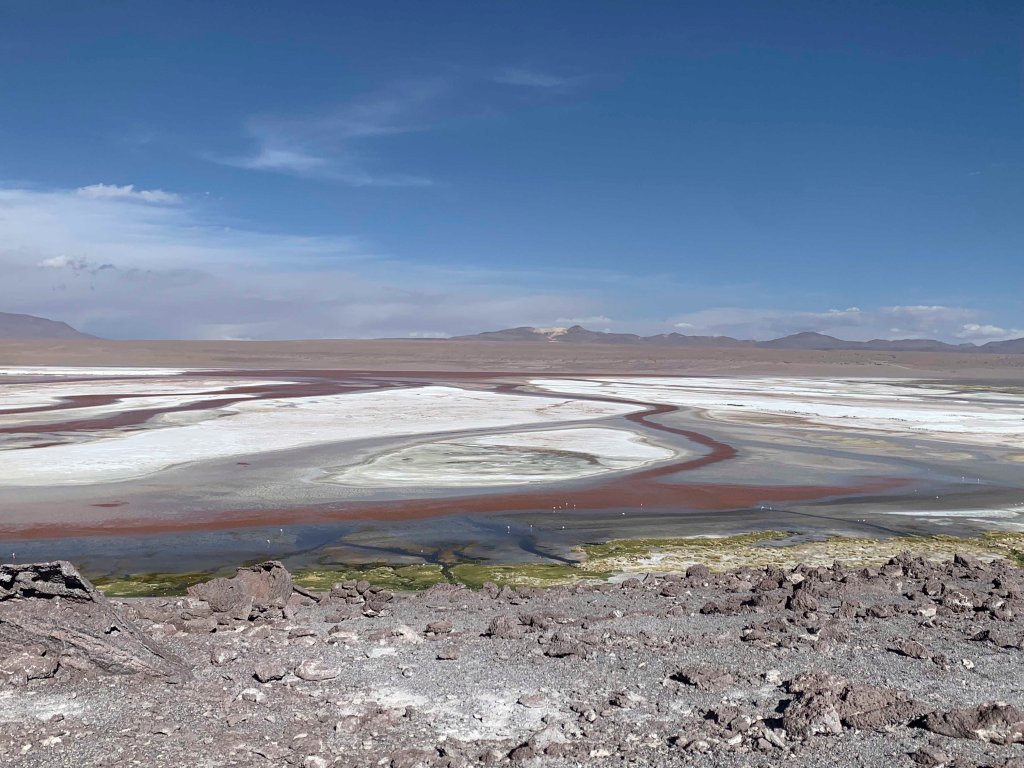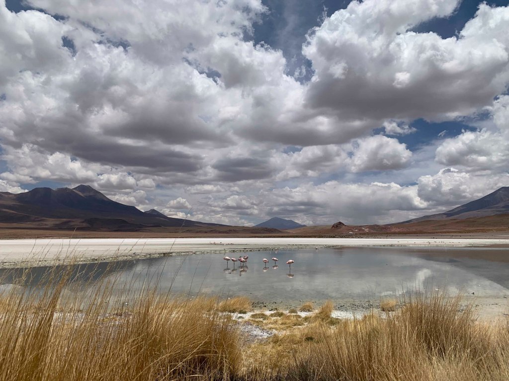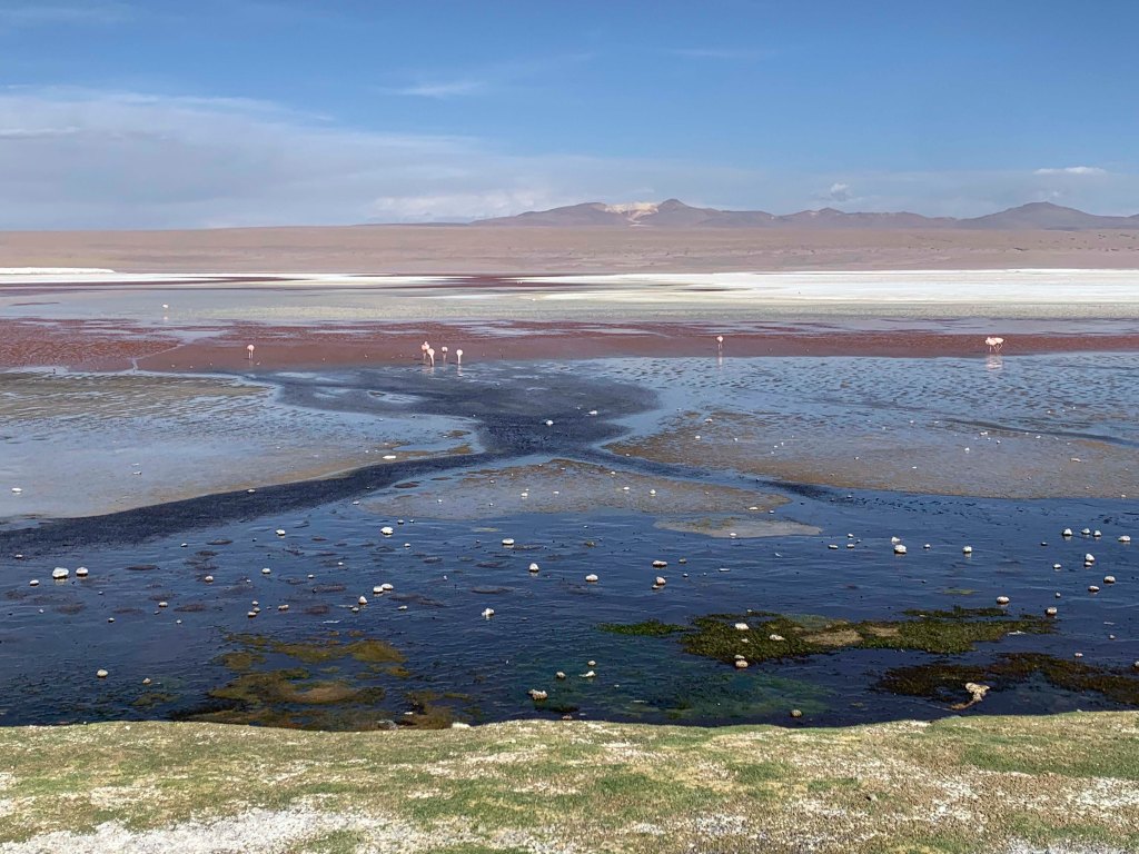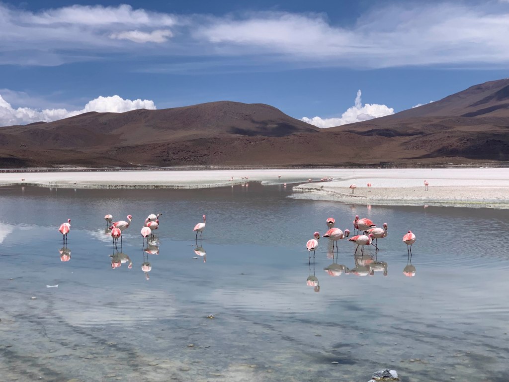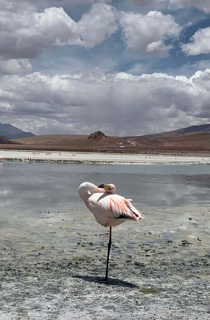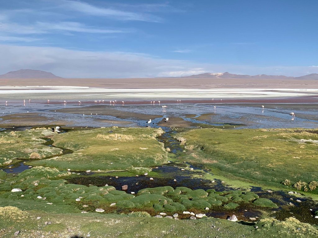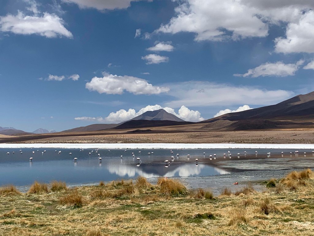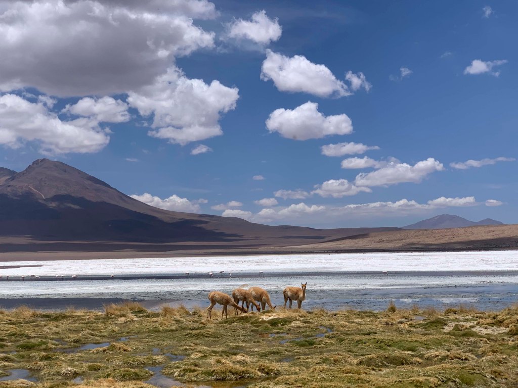 Der nächste Abschnitt unseres Weges war den Lagunen gewidmet: Relativ nah beieinander beeindrucken die Laguna Cañapa, Hedionda, Chiar Khota, Honda und Ramaditas mit verschiedenen Farben und Salzkrusten sowie ihren elegantesten Bewohnern, den Flamingos. Ab und zu werden diese von Vicuñas unterstützt, und auch hier trifft man auf bewaffnete Ordnungshüter, weil alles Grenzgebiet zu Chile ist.