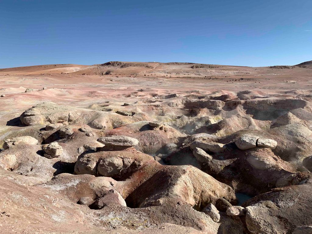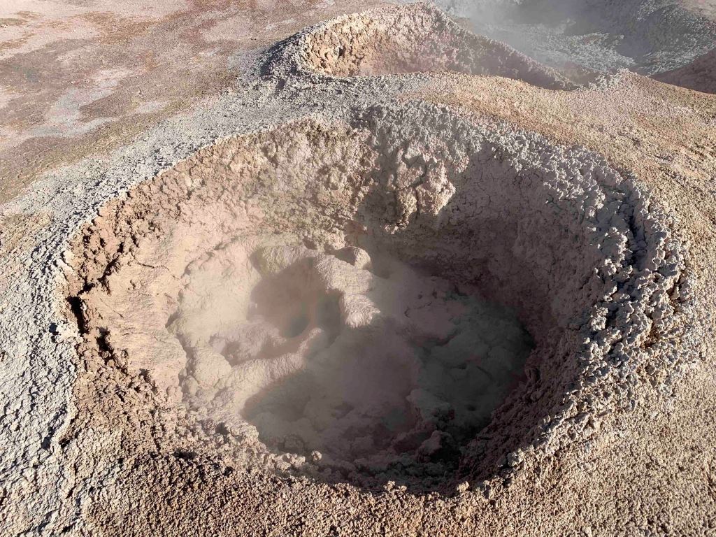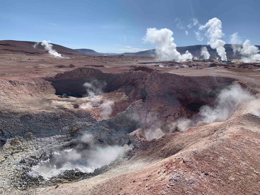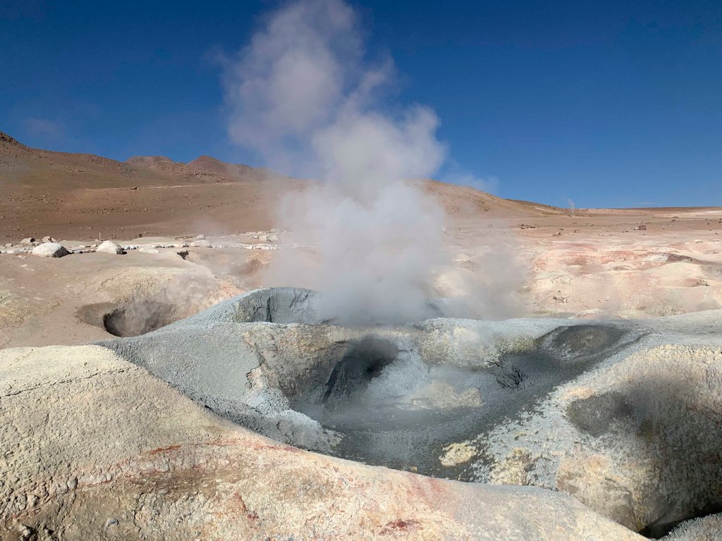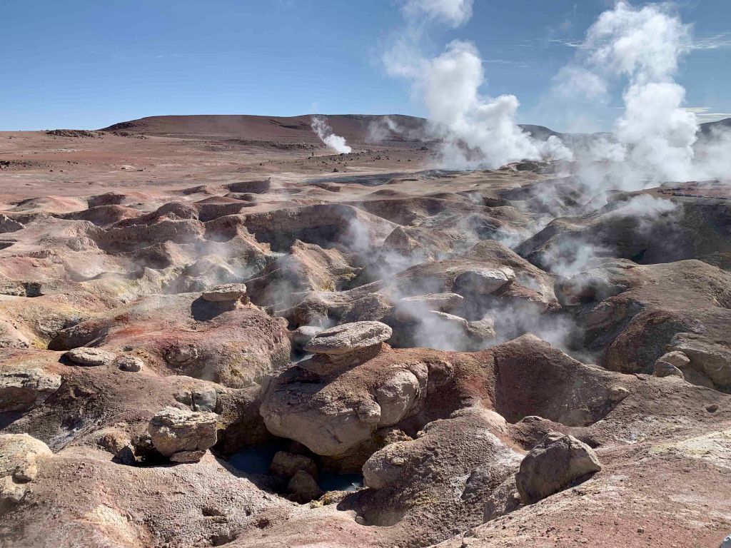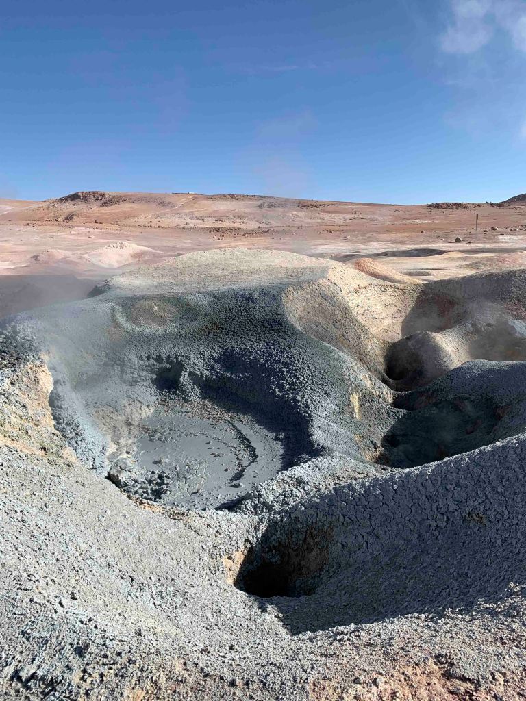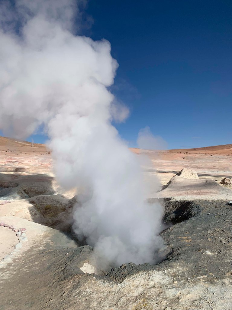 Aber noch hatten wir nicht alles gesehen, was die Provinz Potosi zu bieten hat. Deshalb brachen wir nach einer kalten Nacht früh am nächsten Morgen zum Geysirfeld „Sol de Mañana“ auf. In der superklaren Luft auf 4850 Metern Höhe erstrecken sich hier allerlei dampfende und blubbernde Geysire, es zischt und riecht ordentlich nach Schwefel. Man fühlt sich ein bisschen auf einen anderen Stern oder nach Mordor versetzt…