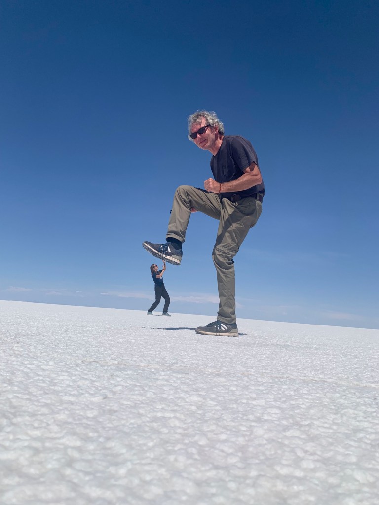Nach dem Besuch der Kaktusinsel freute sich Hugo darauf, mit uns „funny pictures“ zu schießen, was wir zunächst mal gar nicht so gern tun wollten. Eigentlich sind wir nicht so die Poser und grundsätzlich mehr an den Landschaften selbst als an unserem Erscheinen auf Bildern interessiert. Hugo zuliebe ließen wir uns aber auf die Fotosession ein – und hatten dann einen Riesenspaß daran! Mit dem Hopser am Schluss feierten wir unseren Reise-Halbzeit-Tag: Drei Monate und eine Woche unterwegs, noch einmal so viel vor uns.