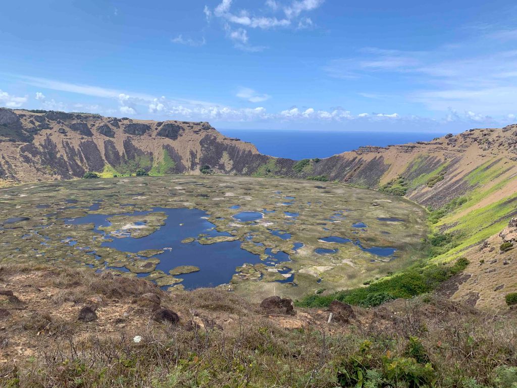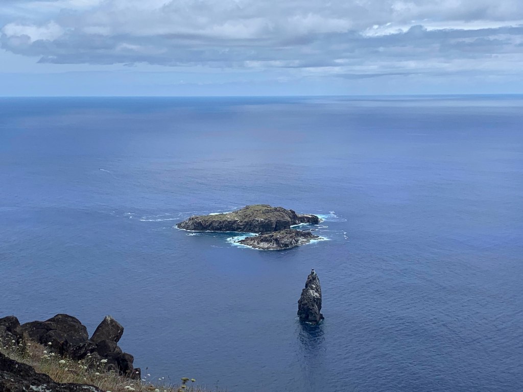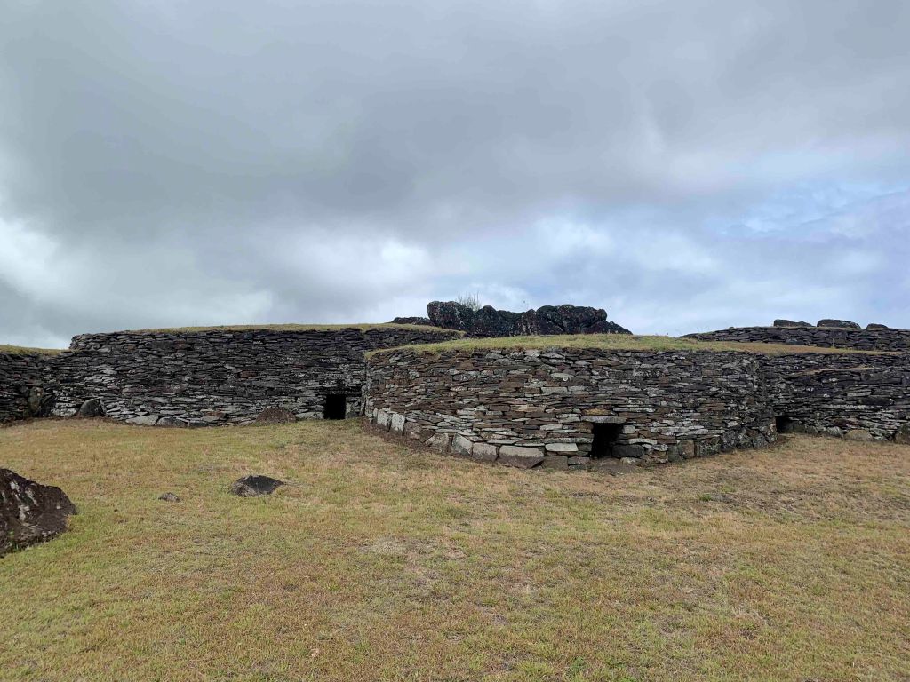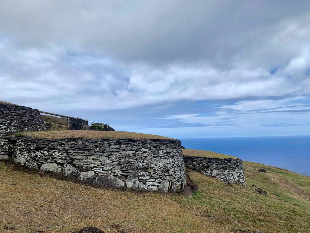 Am westlichen Rand des Kraters befindet sich übrigens das Vogelmannsdorf Orongo. Die niedrigen massiven Rundgebäude sollen für verschiedene Zeremonien, aber auch zur Findung des neuen Inselhäuptlings, des Vogelmannes, gebaut worden sein. Dieser musste sich seinen Posten hart verdienen, indem er in einem Wettbewerb mit anderen Anwärtern erfolgreich die hohen Klippen von Orongo hinabkletterte, mit einem winzigen Binsenfloß zur Felseninsel Moto Nui schwamm, dort auf das erste Ei der Rußseeschwalbe wartete und es dann heil zurück nach Orongo brachte. Kaum vorstellbar, wenn man dort hoch über dem Pazifik steht und auf das zwei Kilometer entfernte Inselchen schaut!