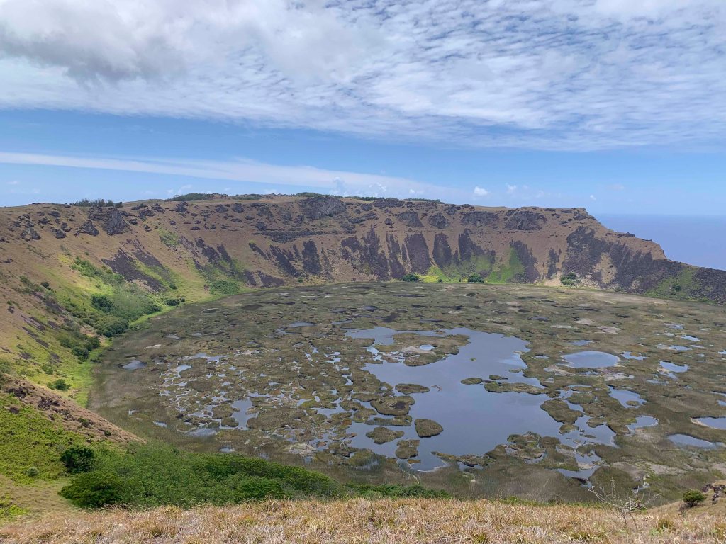 Die Basis von Rapa Nui bilden drei in einem Dreieck angeordnete Vulkane und so lag es nahe, eine Wanderung zu einem Krater, dem Rano Kau, zu machen. Die Landschaft ist wirklich sehenswert, die Vegetation sehr abwechslungsreich und der mit Regenwasser gefüllte Krater ein echtes Aha-Erlebnis. Wir freuten uns aber ebenso über die Begleitung der anhänglichen Inselhunde!
