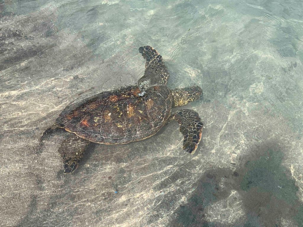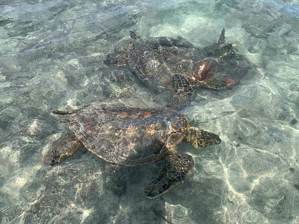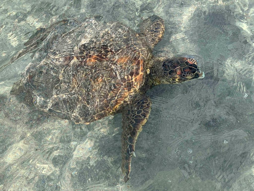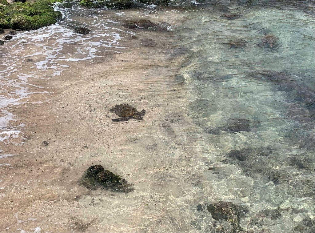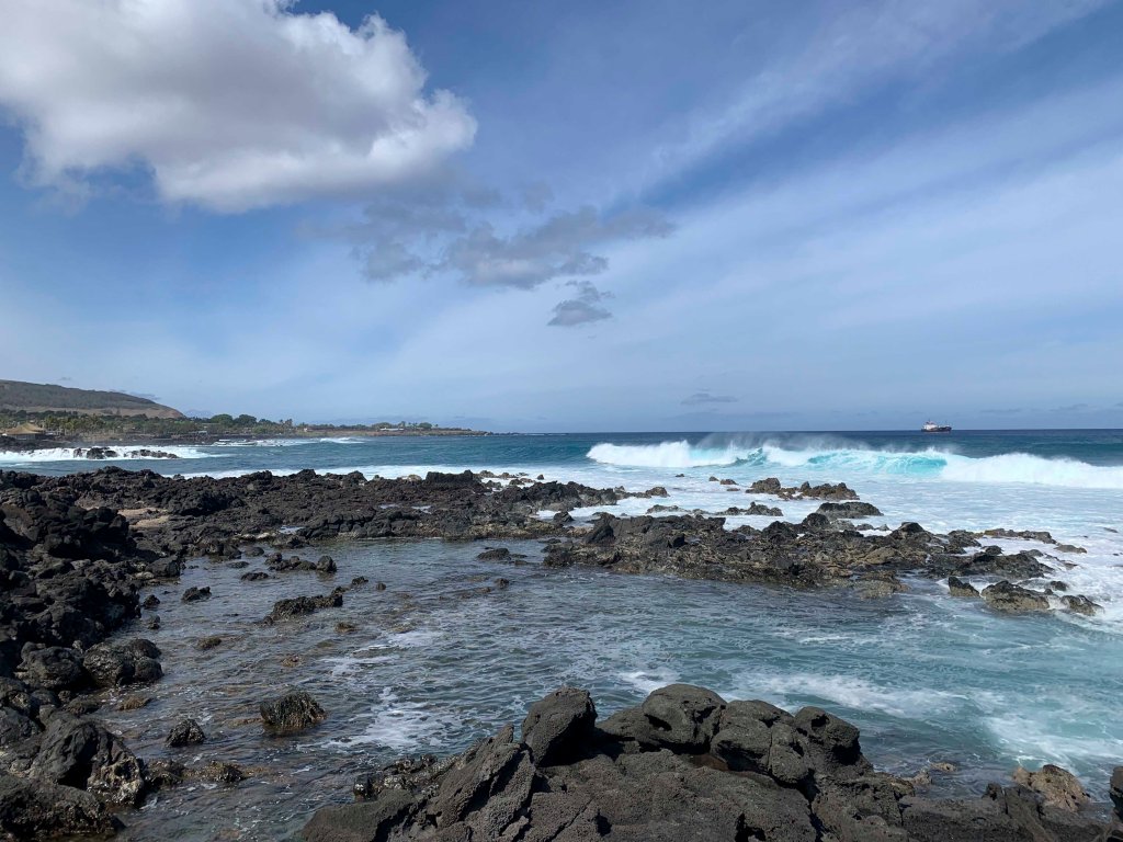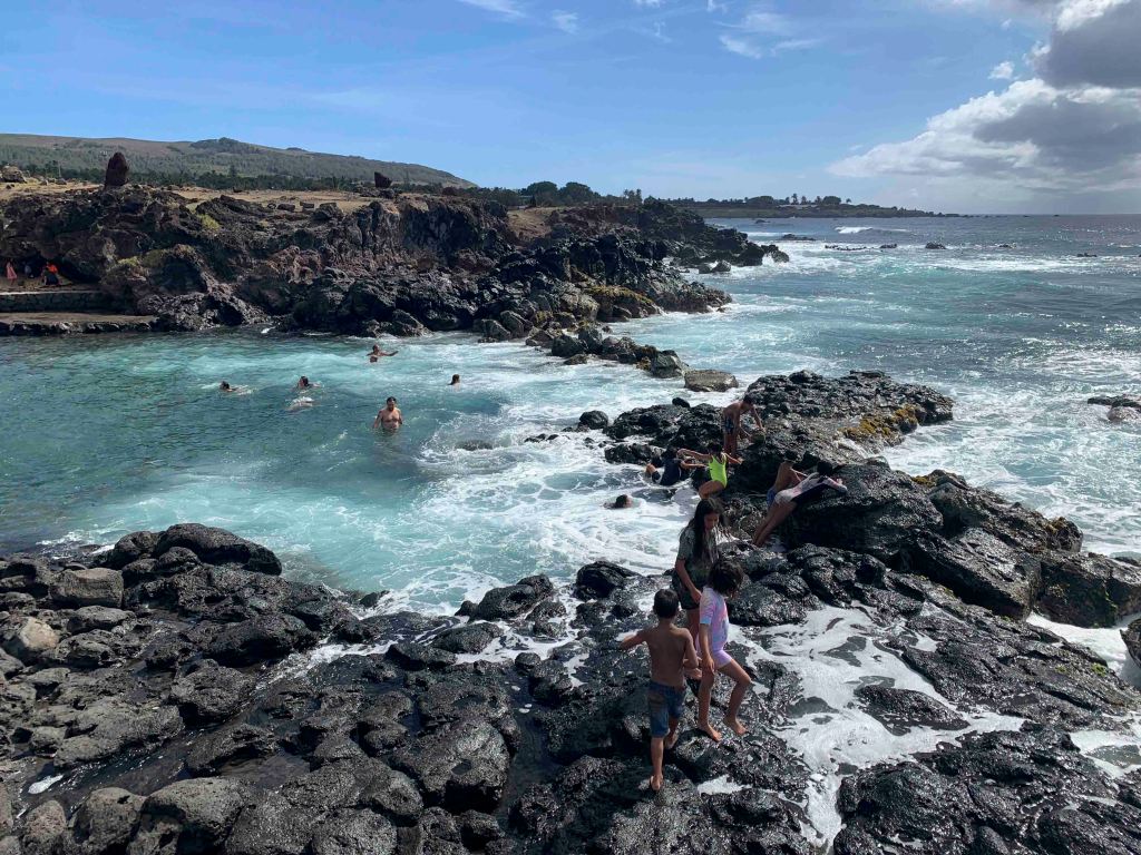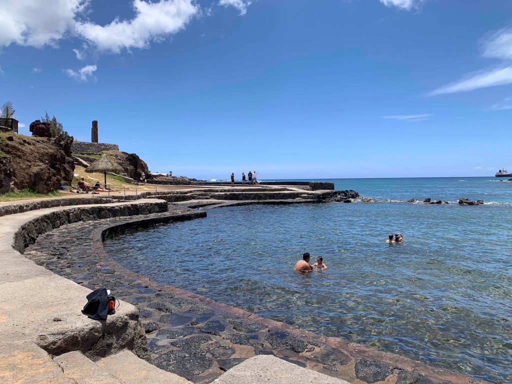 Der zweite große Star von Rapa Nui ist eindeutig das Meer: allgegenwärtig, wunderschön und von der Temperatur her genau richtig, um zu Weihnachten darin zu baden. Es gibt einmal westlich und einmal östlich vom kleinen Hafen zwei sehr schöne Badestellen mit vorgelagerten Wellenbrechern, wo auch Kinder und nicht so ozeanfeste Schwimmer wie ich zum Beispiel ihre Freude haben. Außerhalb dieser Badestellen findet man in Ufernähe übrigens häufig Meeresschildkröten, die man sehr gut beobachten kann, weil sie gar nicht scheu sind. So ist es wirklich schwierig, die Aufforderung auf den Schildern am Strand zu befolgen, den Schildkröten nicht zu nahe zu kommen, selbst wenn man sich sehr bemüht.