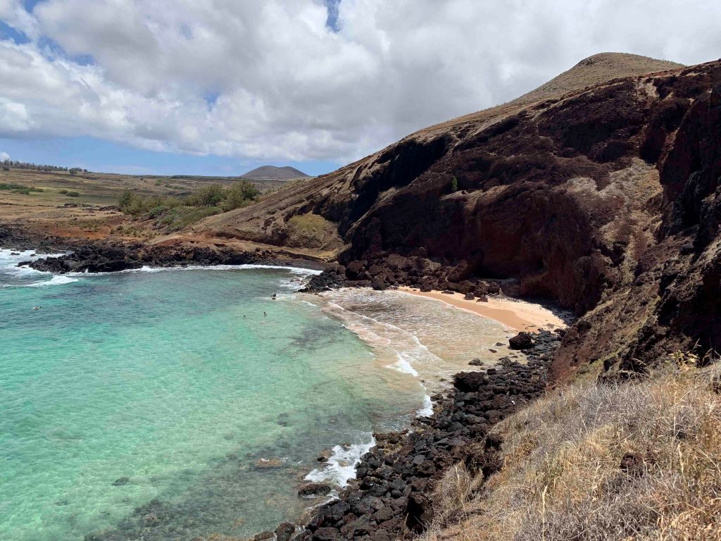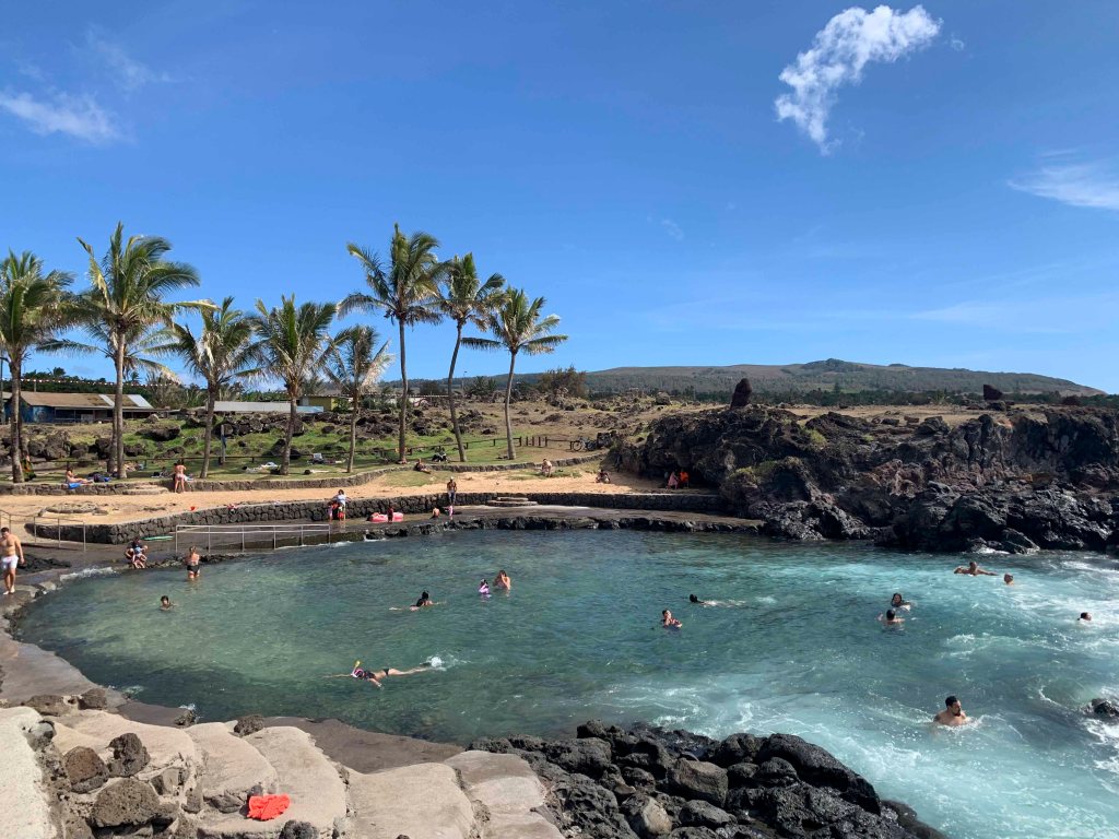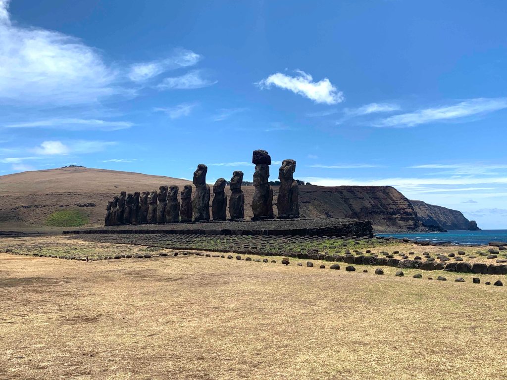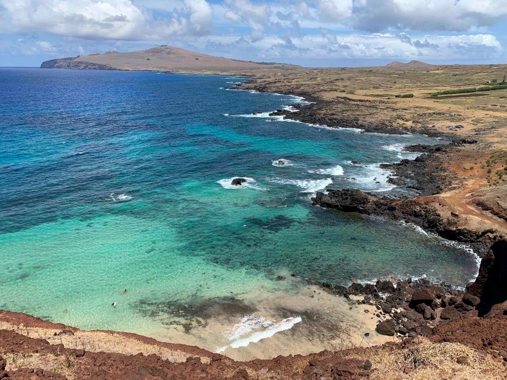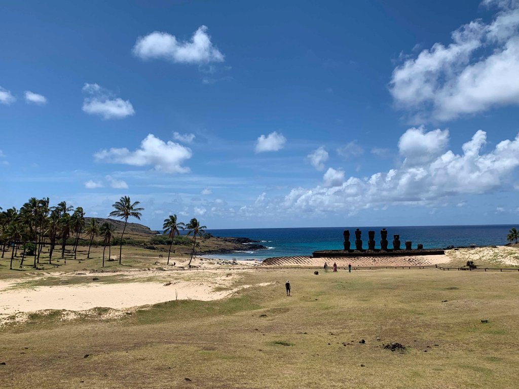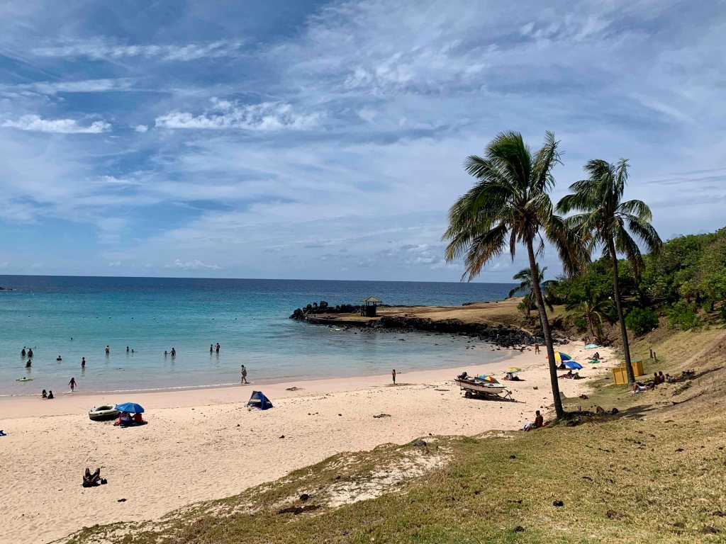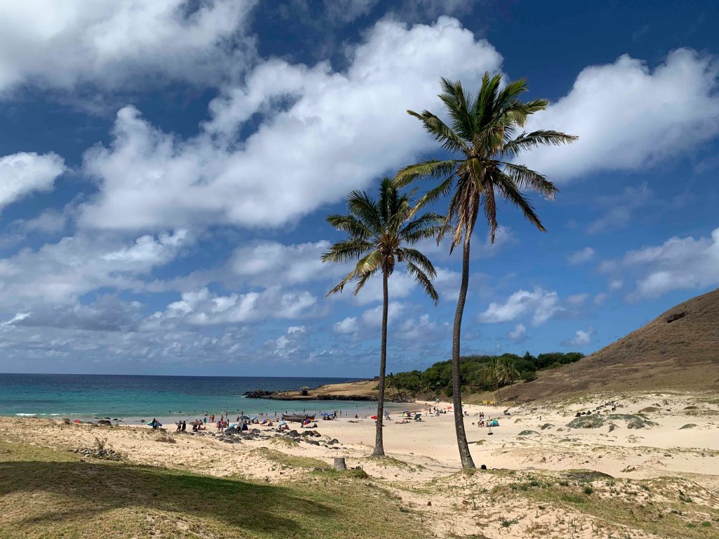 An der Nordseite Rapa Nuis befindet sich ein weiterer Superlativ: der Sandstrand von Anakena, für uns einer der schönsten Strände der Welt! Die Bucht und das Wasser sind unglaublich sauber und in jeder Hinsicht perfekt, um ein paar völlig entspannte Stunden am und im Meer zu verbringen. Außerdem gibt es dort einen der letzten Palmenhaine der Insel und eine wunderbare Moaigruppe, die vor dem Strand Wache zu halten scheint. – Übrigens gibt es heftig umstrittene Theorien zur Kopfbedeckung der Moai, denn Hüte (wie man zuerst annehmen könnte) waren auf der Insel völlig unüblich. Mittlerweile wird vermutet, dass die wuchtigen Steine auf den Köpfen mancher Moai vielleicht Frisuren sein sollen…