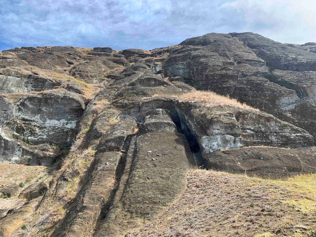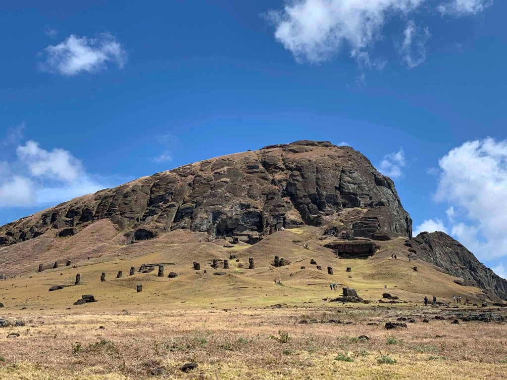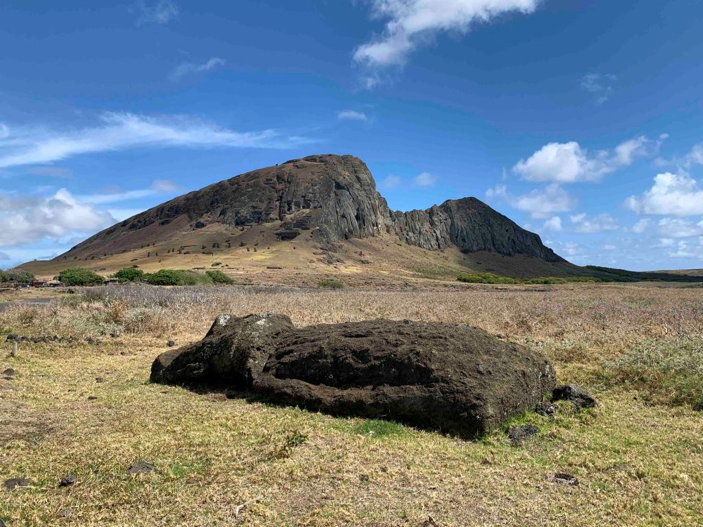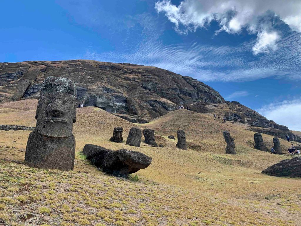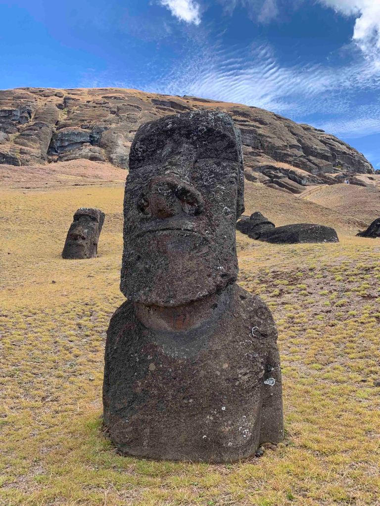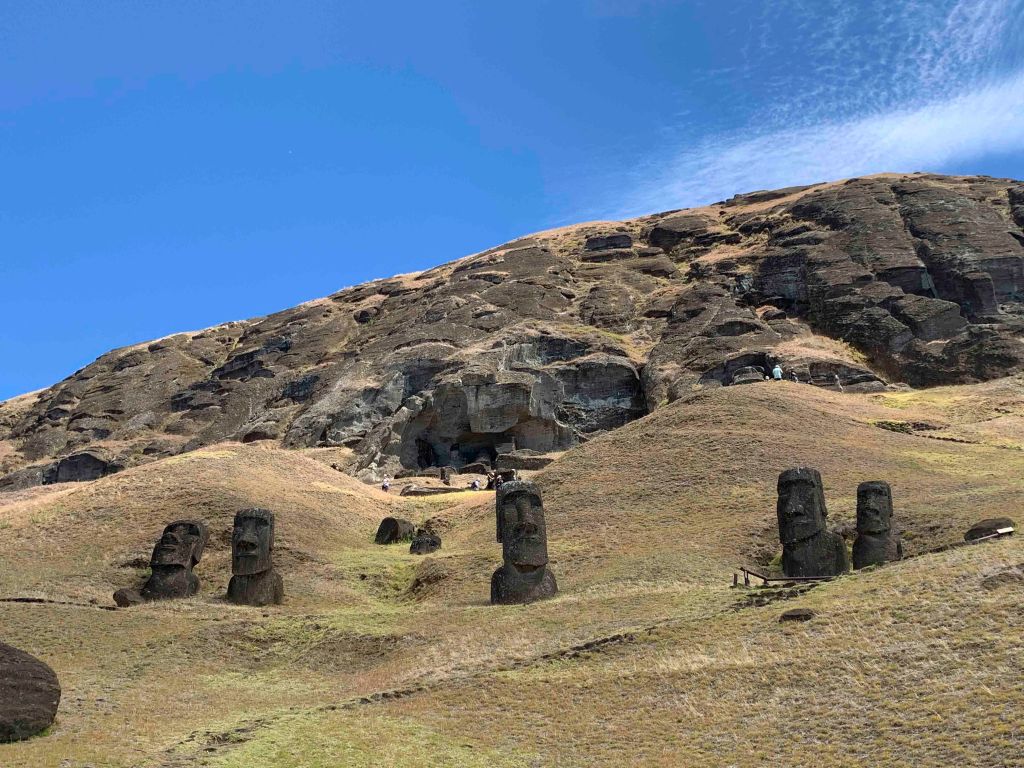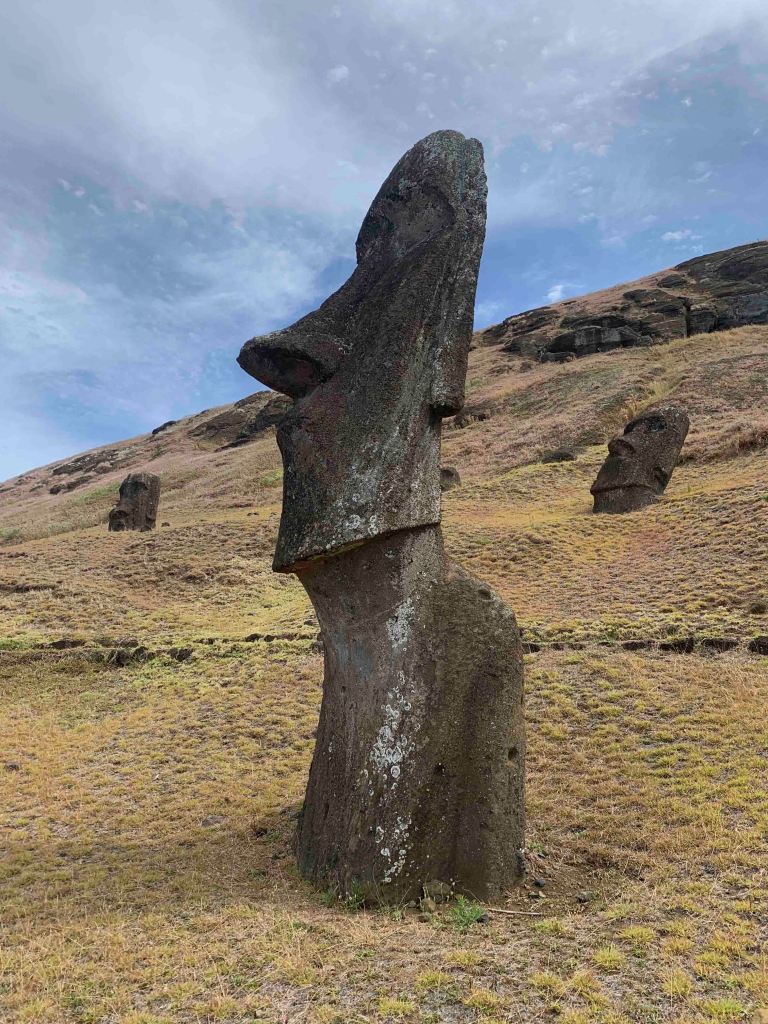 Der Steinbruch der Moai, Rano Raraku, ist ein faszinierender Ort. Rund um den Berghang, an dem man die Moai aus dem Tuffstein herausmeißelte, befinden sich noch fast 400 angefangene Statuen in den unterschiedlichsten Bearbeitungsstadien. An manchen Stellen kann man suchen und knobeln, um schließlich gleich an die zehn Figuren gleichzeitig zu entdecken. Es ist ein Lost Place der ganz besonderen Art, denn man erkennt, dass die Herstellung der Moai quasi von einem Tag auf den anderen beendet worden sein muss – warum das geschah, ist nach wie vor nicht eindeutig geklärt. Und auch die vielen schon aufrecht stehenden Moai schauen irgendwie erstaunt drein, als fragten sie sich, warum man sie nicht endlich an ihren Bestimmungsort bringt.