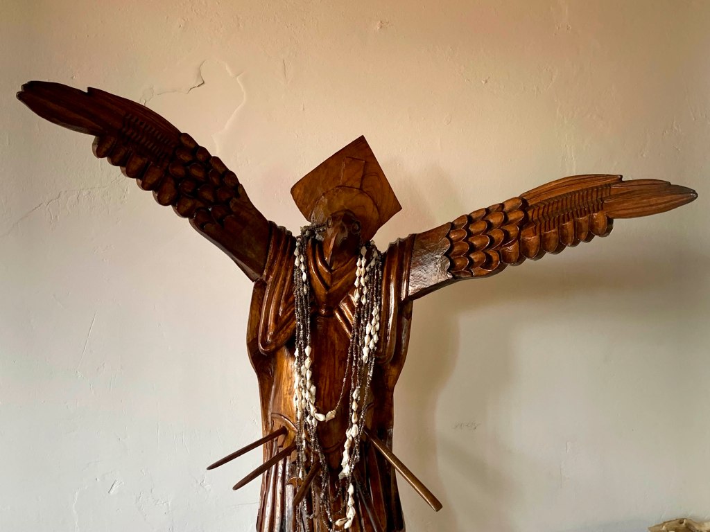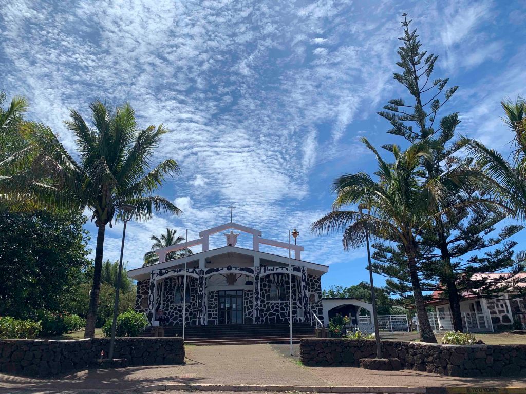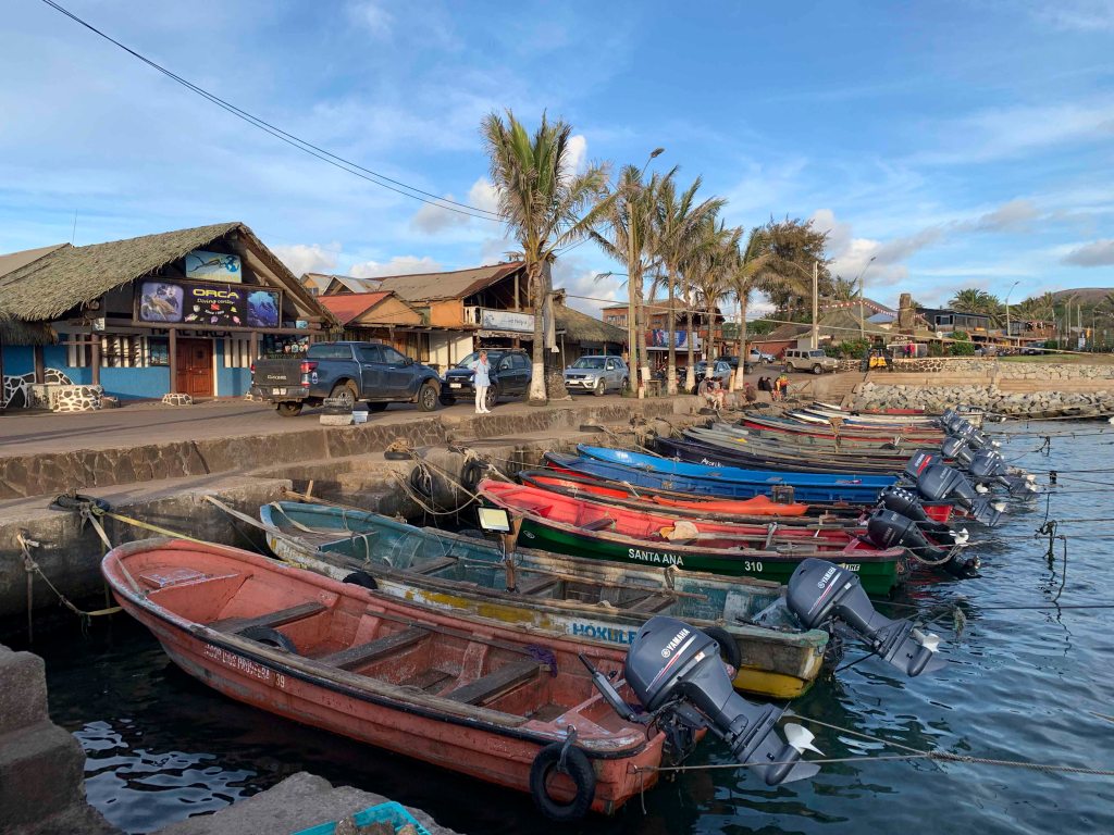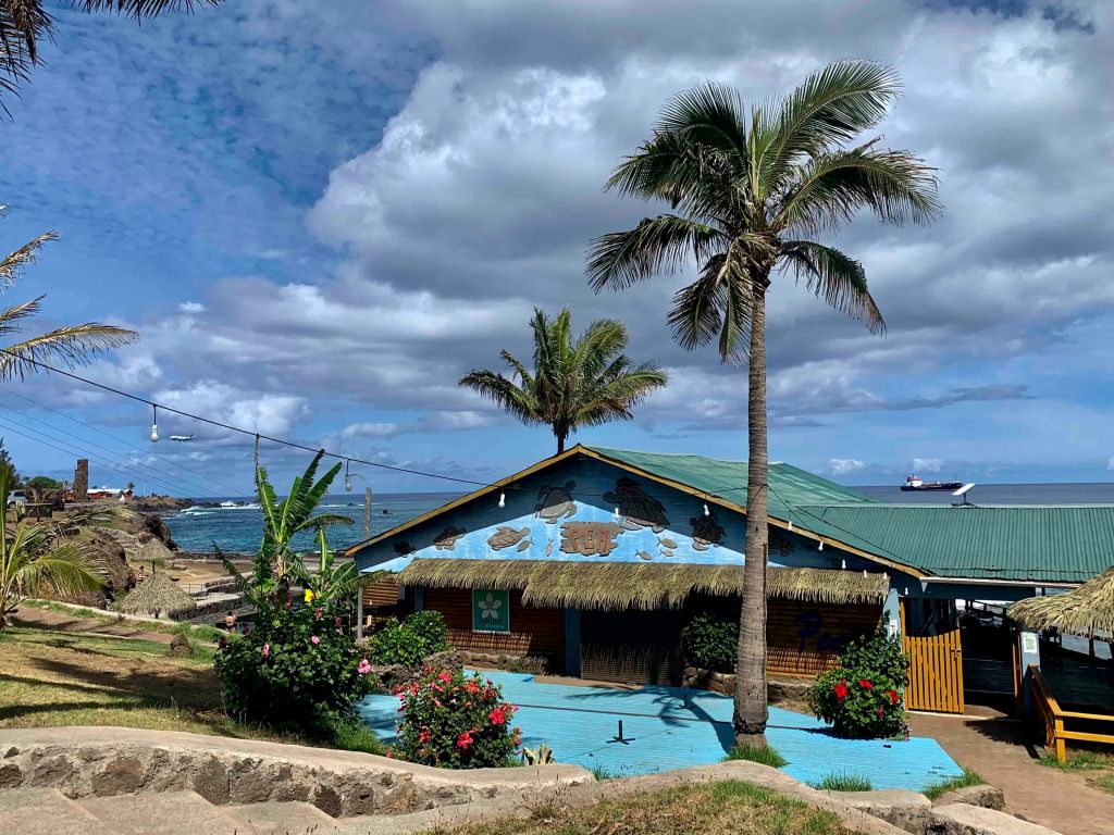Auf Rapa Nui gibt es nur eine einzige Ortschaft, nämlich Hanga Roa an der Südwestküste. Es ist ein beschauliches Dorf mit einem ruhigen und sehr entspannten Lebensrhythmus, etlichen Läden, einem kleinen Fischerhafen und Unmengen von Hibiskusbüschen, die in allen möglichen Farben blühen. Die einzige Kirche findet man recht zurückhaltend am Rand des Ortes, in ihr verbindet sich christliche mit indigen-religiöser Symbolik. – Die vielen vorhandenen Unterkünfte für Touristen sind erfreulich an die Inselbebauung angepasst, alles ist sehr grün und größere Bettenburgen sucht man zum Glück vergeblich. So lag auch unser Häuschen zusammen mit einigen wenigen anderen Bungalows in einem großen Garten, fußläufig zum Meer!