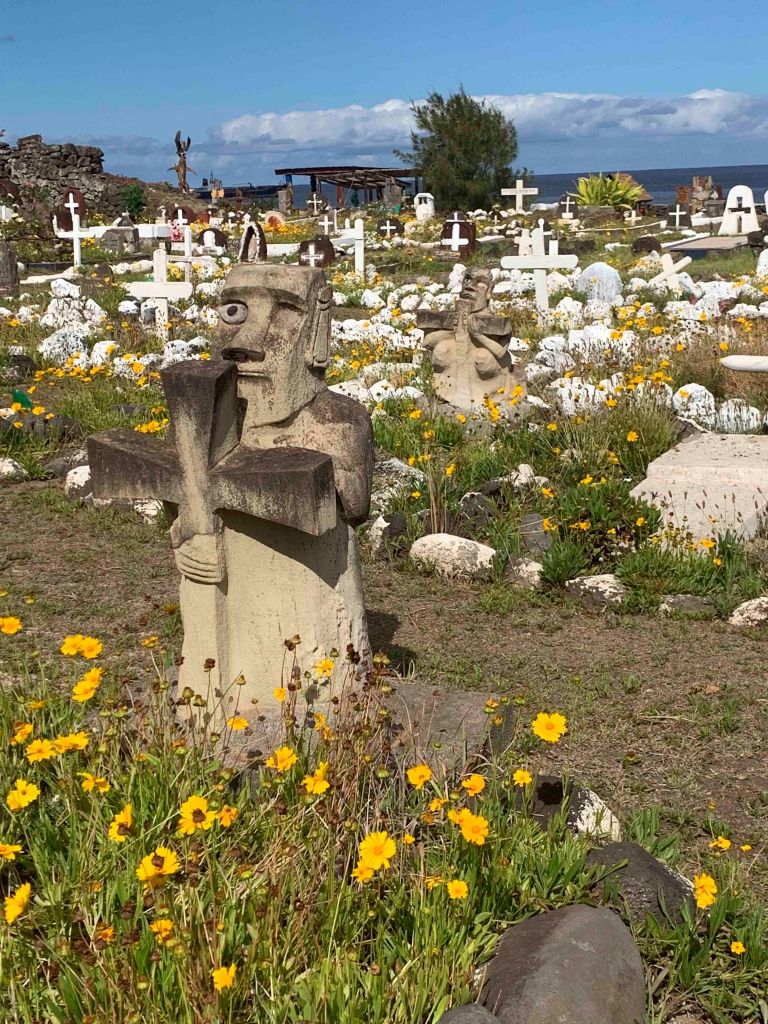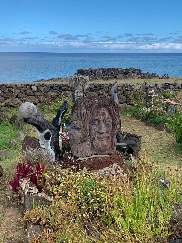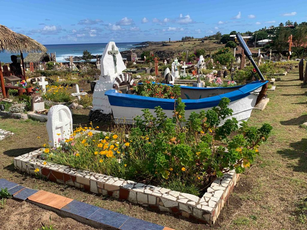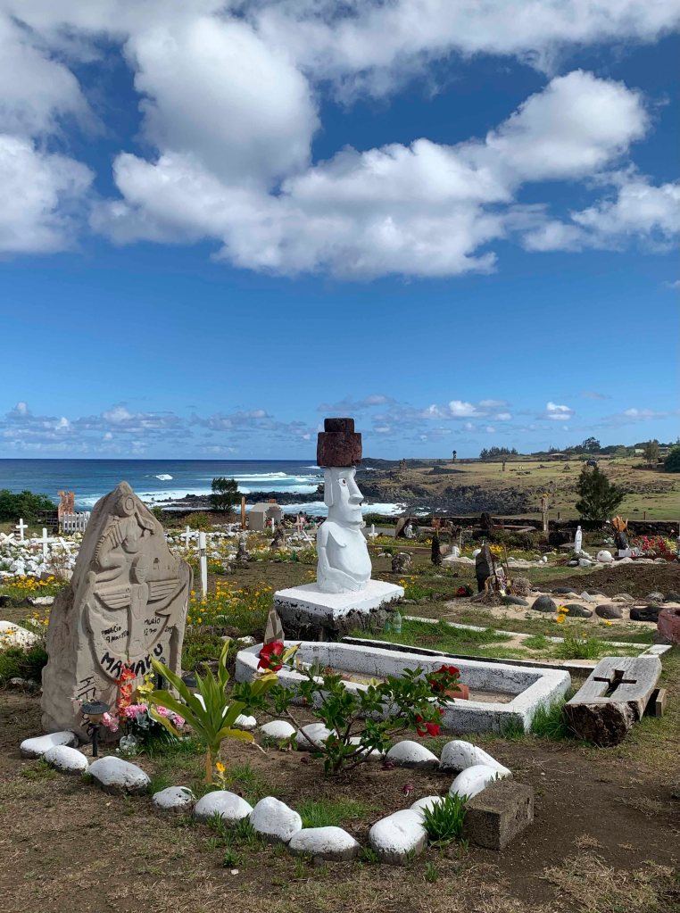 An der Küste neben Hanga Roa befindet sich auch der Inselfriedhof – von uns zum am schönsten gelegenen Friedhof der Welt gekürt. Überall zwischen den sehr fantasievoll gestalteten Gräbern blühen gelbe Blumen und das blaue Meer rauscht im Hintergrund, hier kann man sich die ewige Ruhe tatsächlich schön vorstellen. – Allerdings fiel uns auch etwas Trauriges auf, nämlich der relativ niedrige Altersdurchschnitt der hier Begrabenen. Wir entdeckten nur wenige Grabstellen von über Achtzigjährigen und viele deutlich jüngere Verstorbene. Vielleicht war das ein Grund dafür, dass über die Weihnachtstage auch blinkende und leuchtende Lichterketten den Friedhof schmückten, was für eine ganz ungewöhnliche Stimmung sorgte.
